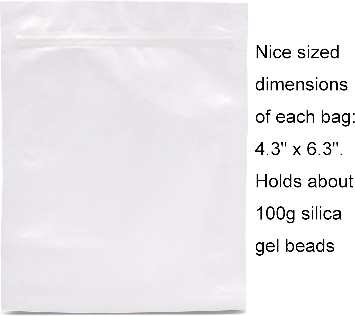 - 【Size and Package Includes】: The package includes 60pcs of resealable storage bags, each with dimensions of 4.3" x 6.3". Each bag can comfortably hold about 100g of silica gel beads.