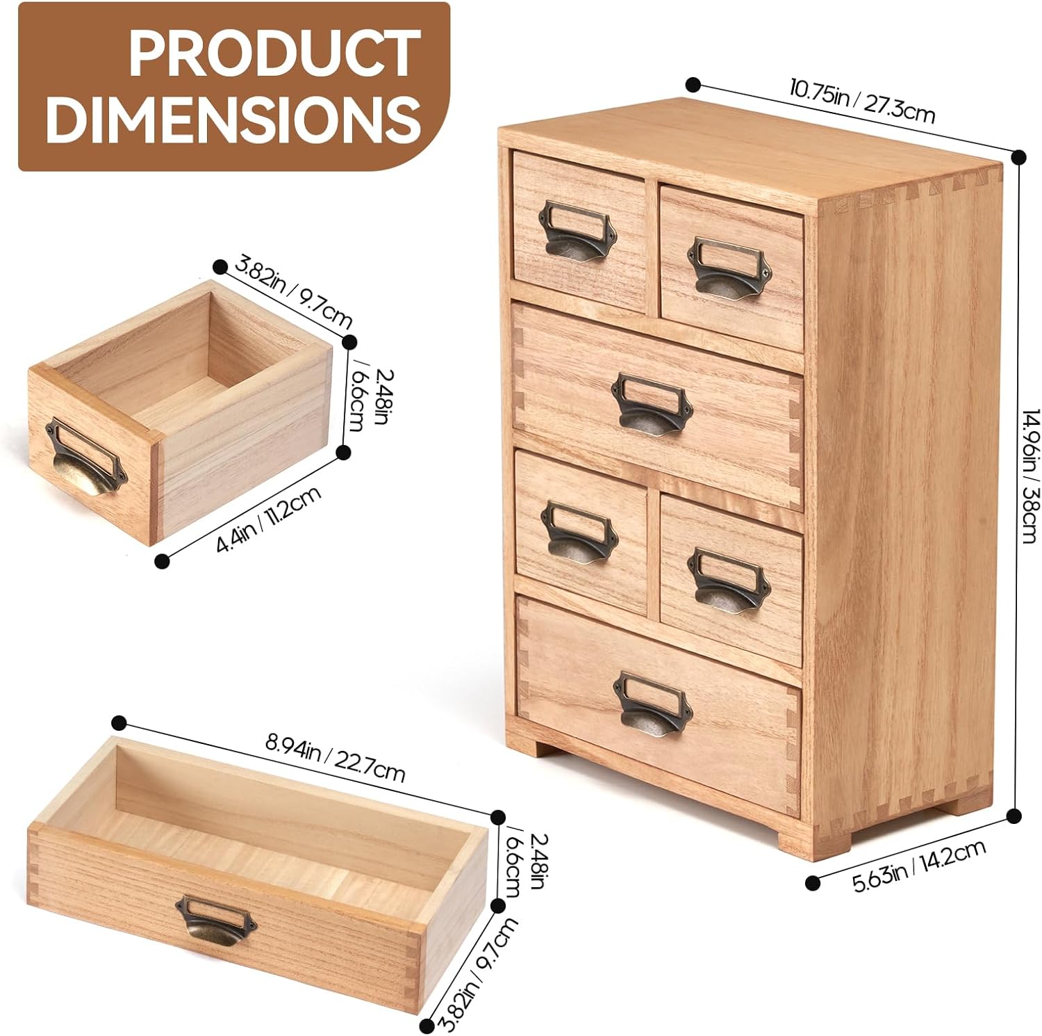 - [CUTE DESIGN] This wooden storage cabinet come with 6 mini drawers, And each drawer has a metal handle and lable holder which is easy opening and searching.