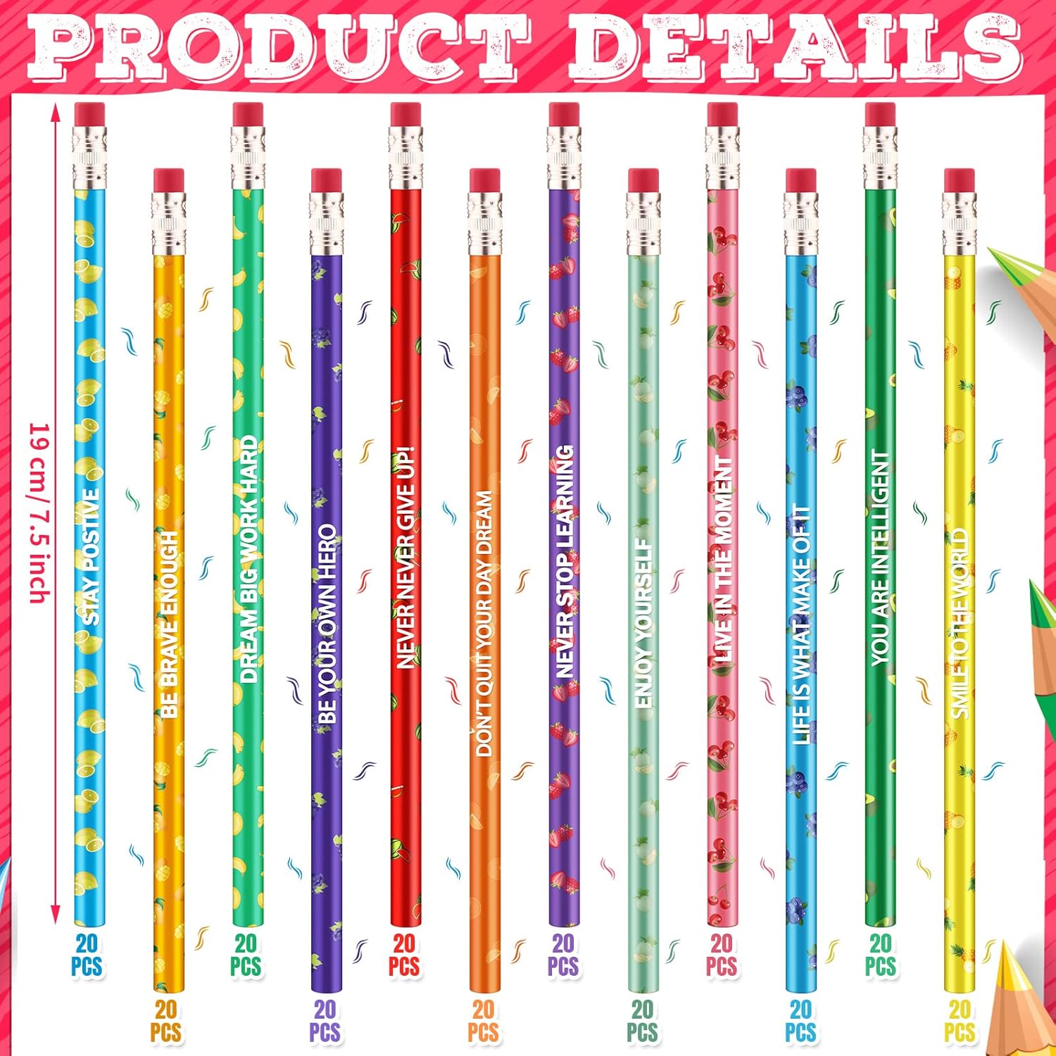 - What's Included in the Package: you will receive 240 pieces of scented pencils in 12 styles, 20 pieces in each style, measuring approx. 19 cm/ 7.5 inches in length, with red, yellow, purple and more, and each color is printed with fruit patterns and motivational sayings, sufficient quantity and diverse styles to meet your daily use and replacement needs