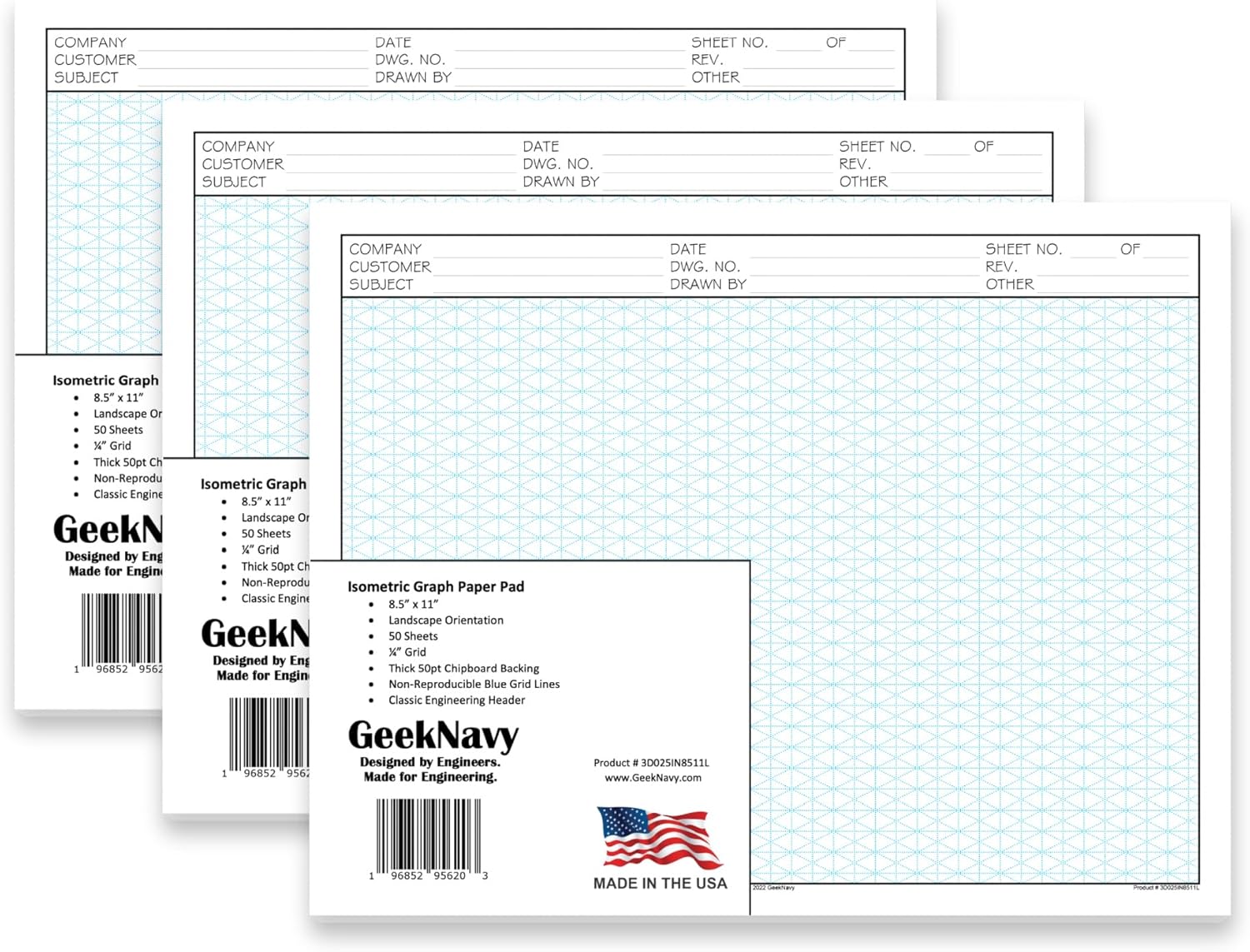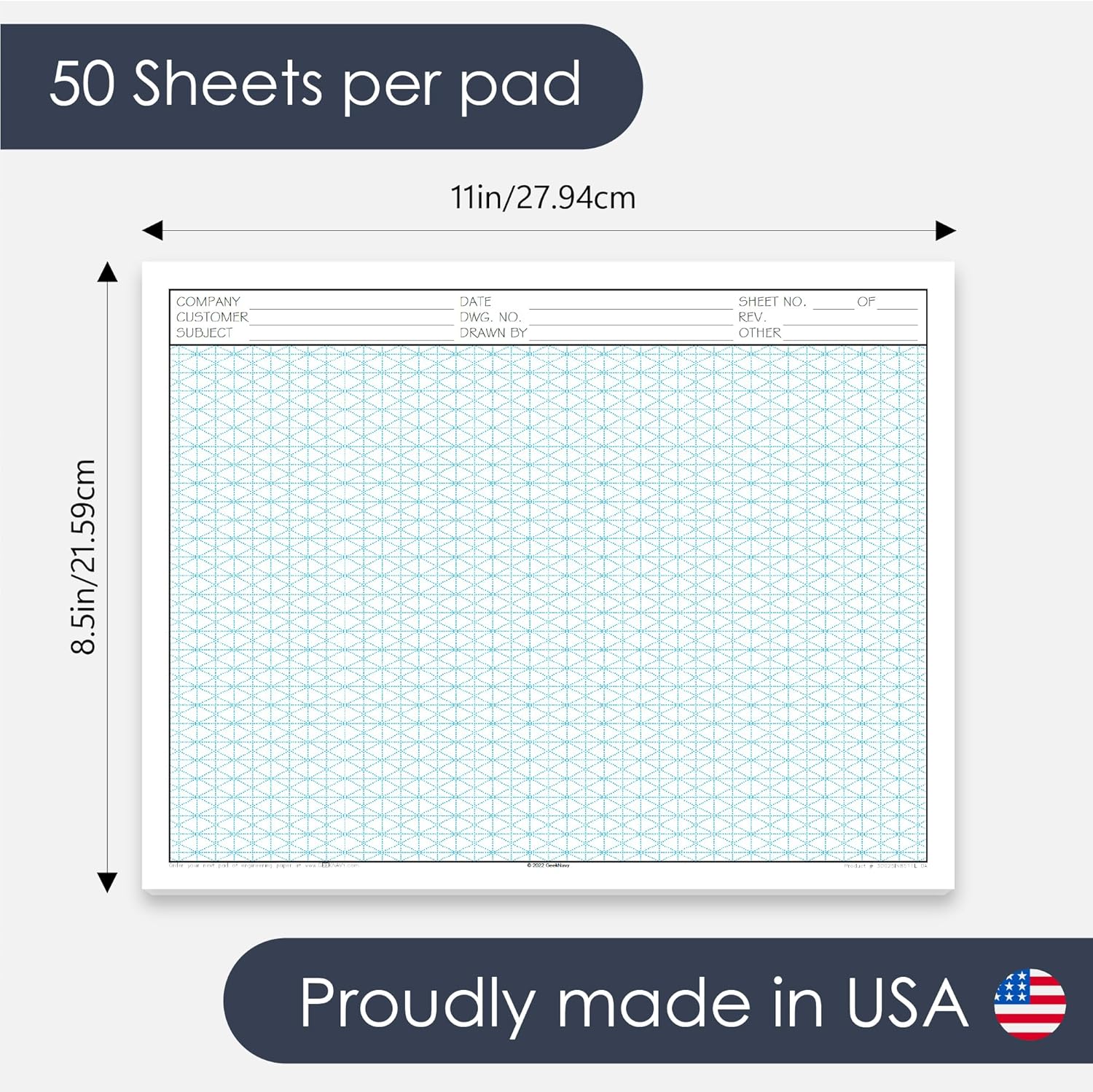 8.5" x 11" Isometric Graph Paper 50 Sheets Landscape - 0.25" Grid, Non-photo Blue, High Brightness, Drafting, Engineering, Art, 3D Design (3-Pack)