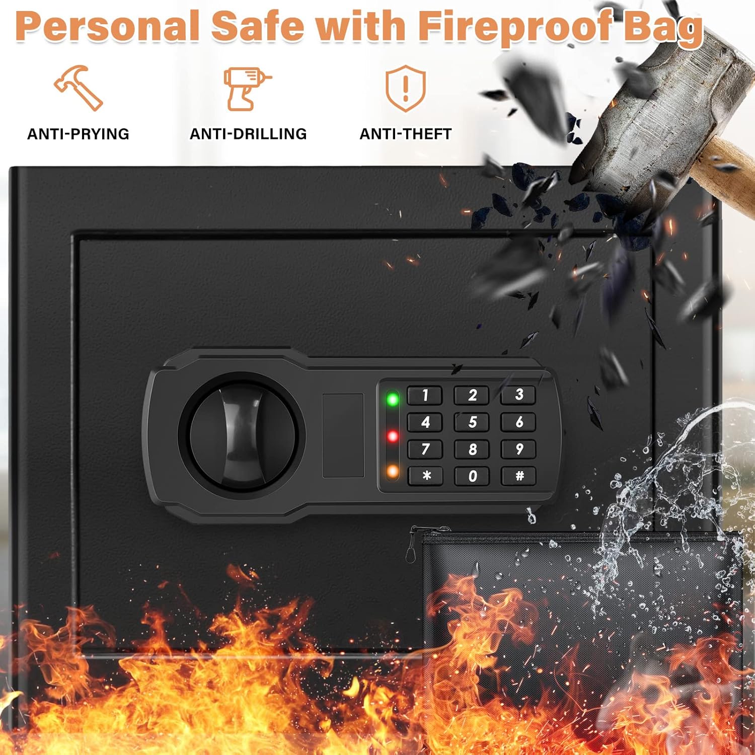 - Home Safe & Fireproof Bag: 1.2 cubic capacity safe box can protect almost all valuable assets and belongings, such as cash, Jewelry, medication, home protection, etc. The combination of a digital safe and a FIREPROOF BAG can protect your valuables from fire, hurricanes and earthquakes. This safe is perfect for securing items AWAY FROM KIDS, THIEVES AND PEOPLE YOU DON'T TRUST