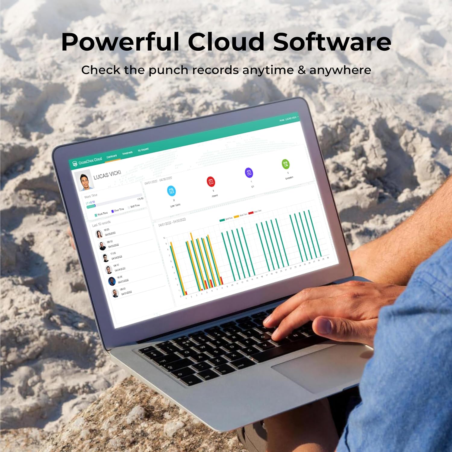 - AUTOMATIC STATISTICS & SYNCHRONIZATION OF DATA: You don’t have to manually add up the punch records anymore, employees’ attendance data will be automatically sent to the cloud software, you can view reports at anytime and make payroll quicker and more accurate. Besides, you can download it and apply the data to Quickbooks and so on