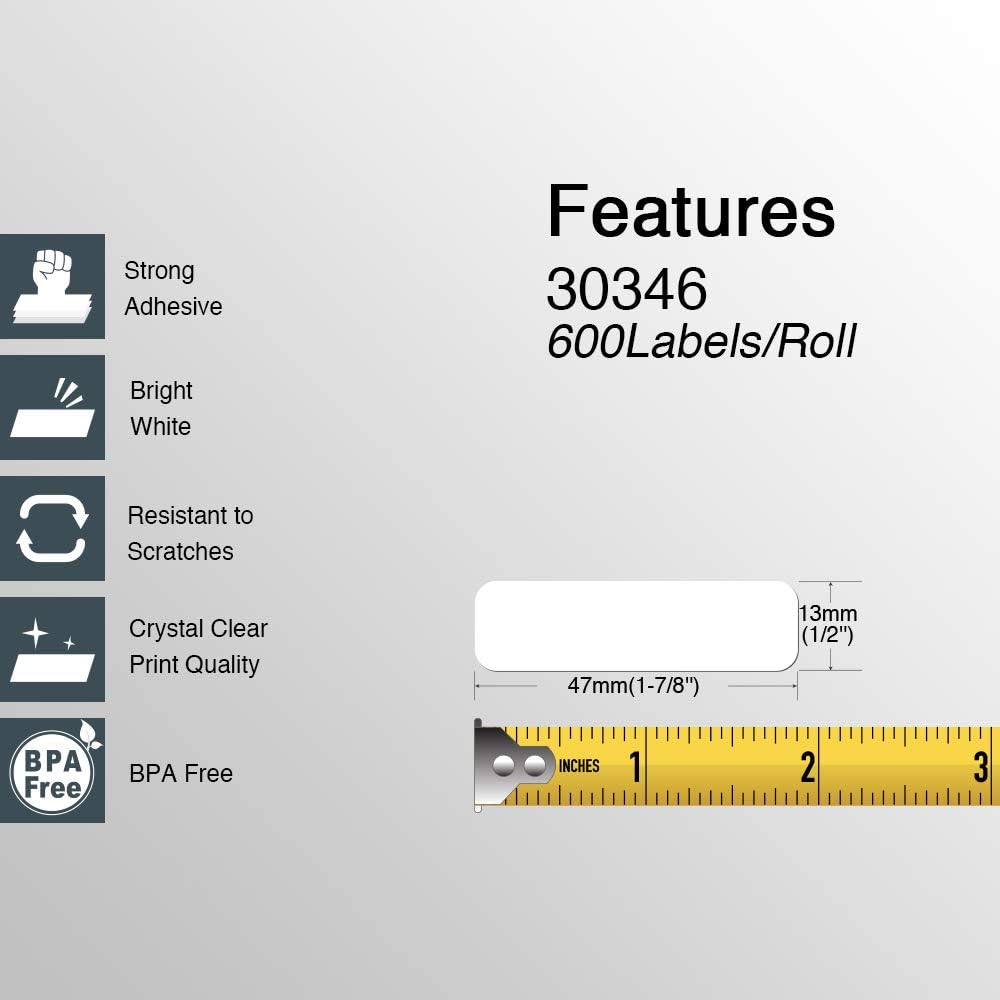 - [ Library Barcode Labels ]: ½ in x 1-7/8 in (13mm x 48mm) labels replace for DYMO LW 30346 are mainly used as library barcode labels. Price tags, distinguishing tags, address labels, FNSKU labels and file folder labels are also applicable .. Widely used on paper, envelopes, letters, packages, jars, bottles, scrapbooking, plastic, cupboards and other items.