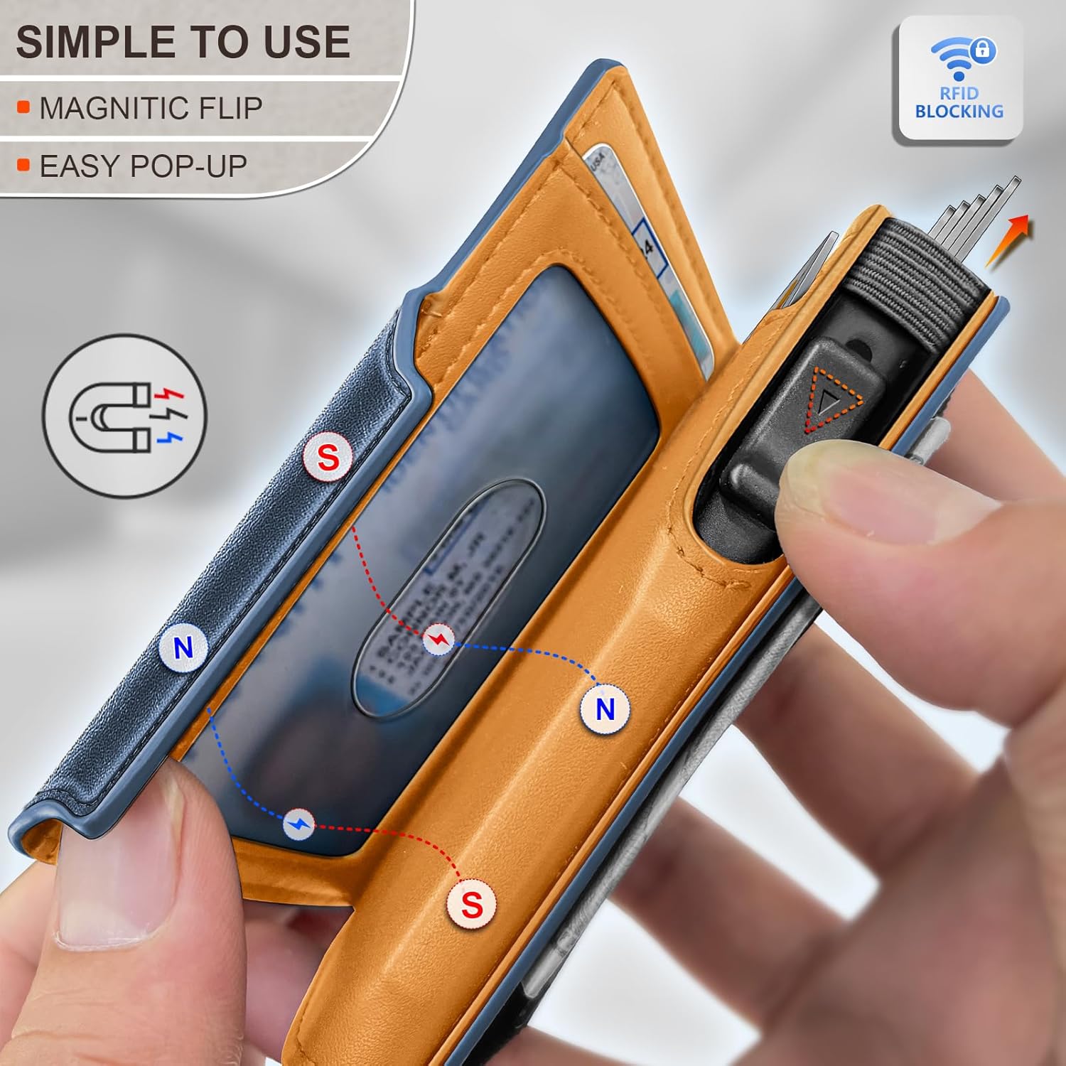 - CAPACITY-Slim wallet with refined layout to fit in front pocket,easy for 8 cards and couple of bills--5 cards in the aluminum case with pop-up access,3 cards in the leather shell;