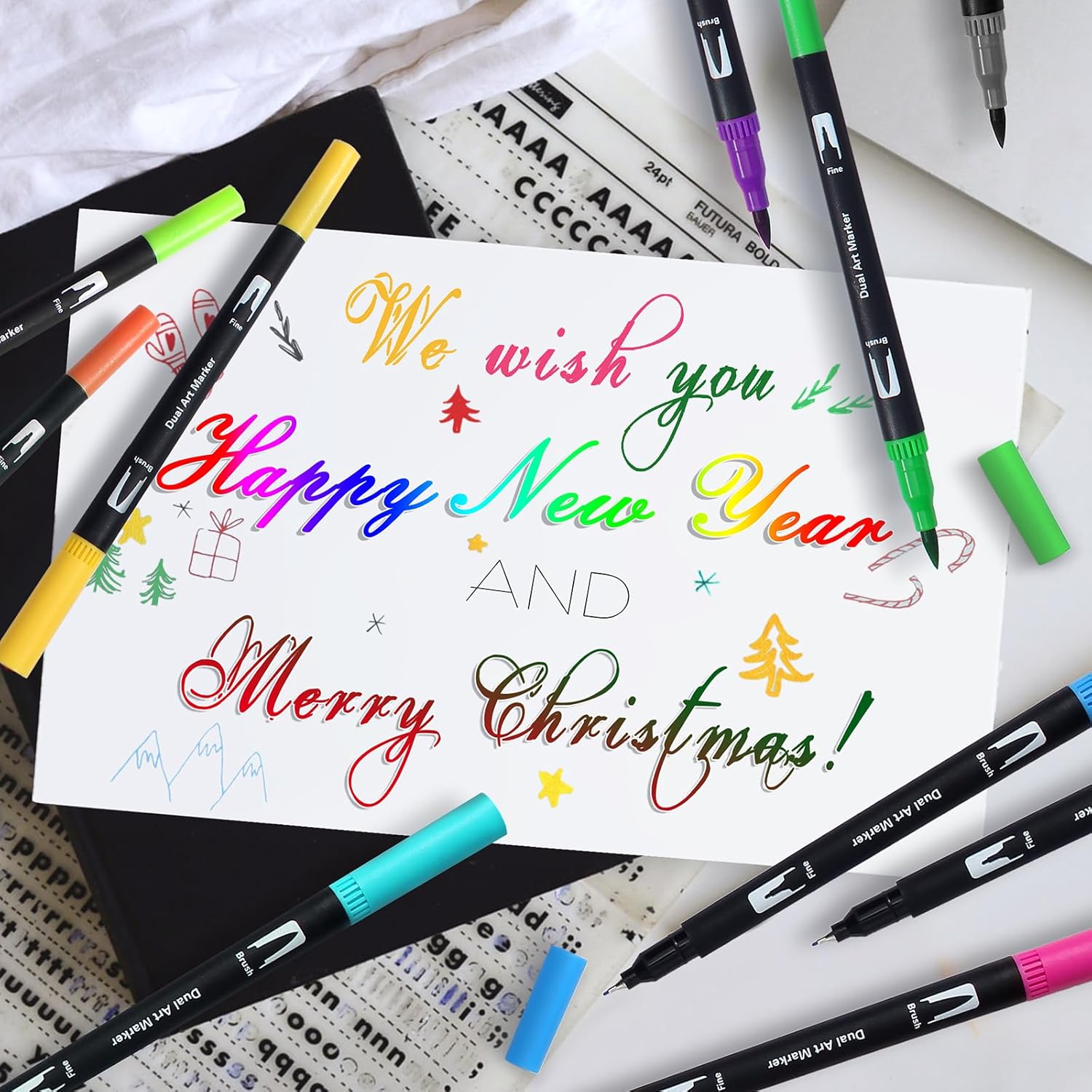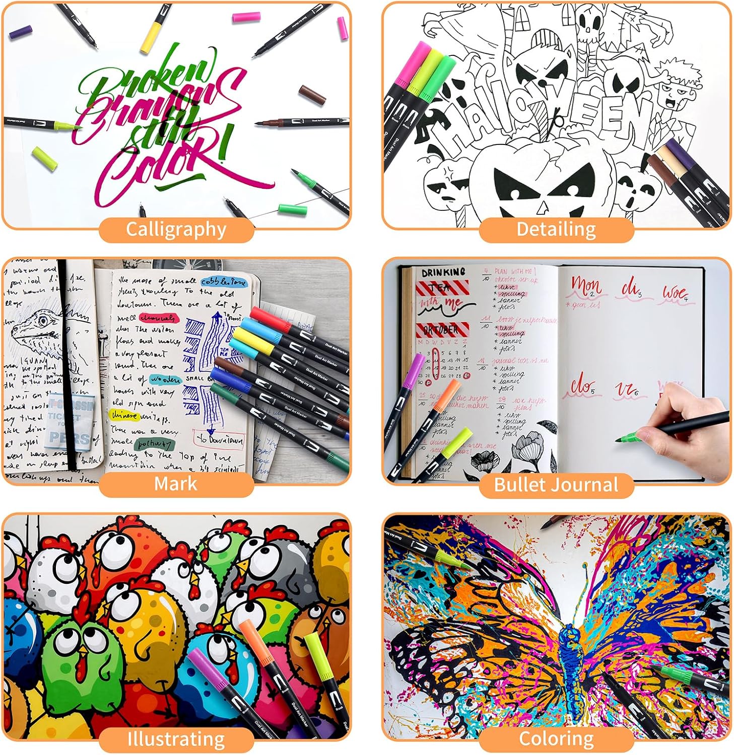 - 32 UNIQUE COLORS:Each art markers set Includes 32 dual-tip brush markers (1-4mm) with ultra-fine tip (0.4mm) for a total of 64 complementary colors (broad dark color and fine light color). Dual colors double your creativity and fun! These artist markers are a must for your next masterpiece.