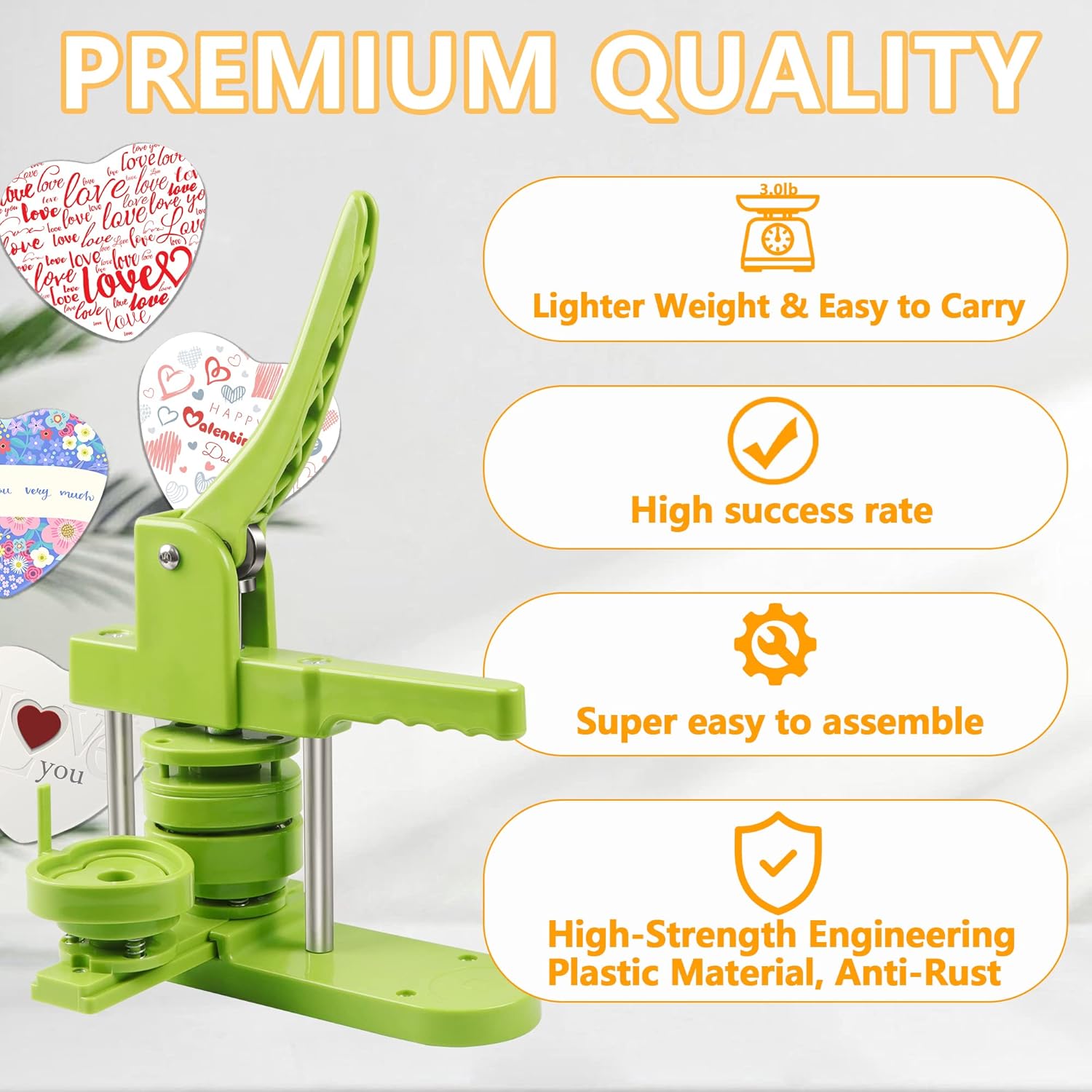 - āļøćHigh Success RatećOur Button pin maker machine has been upgraded in labor-saving positioning design, more accurate positioning, need less force to press, high success rate, very time-saving and labor-saving and easier to make hundreds of DIY buttons in a short time.