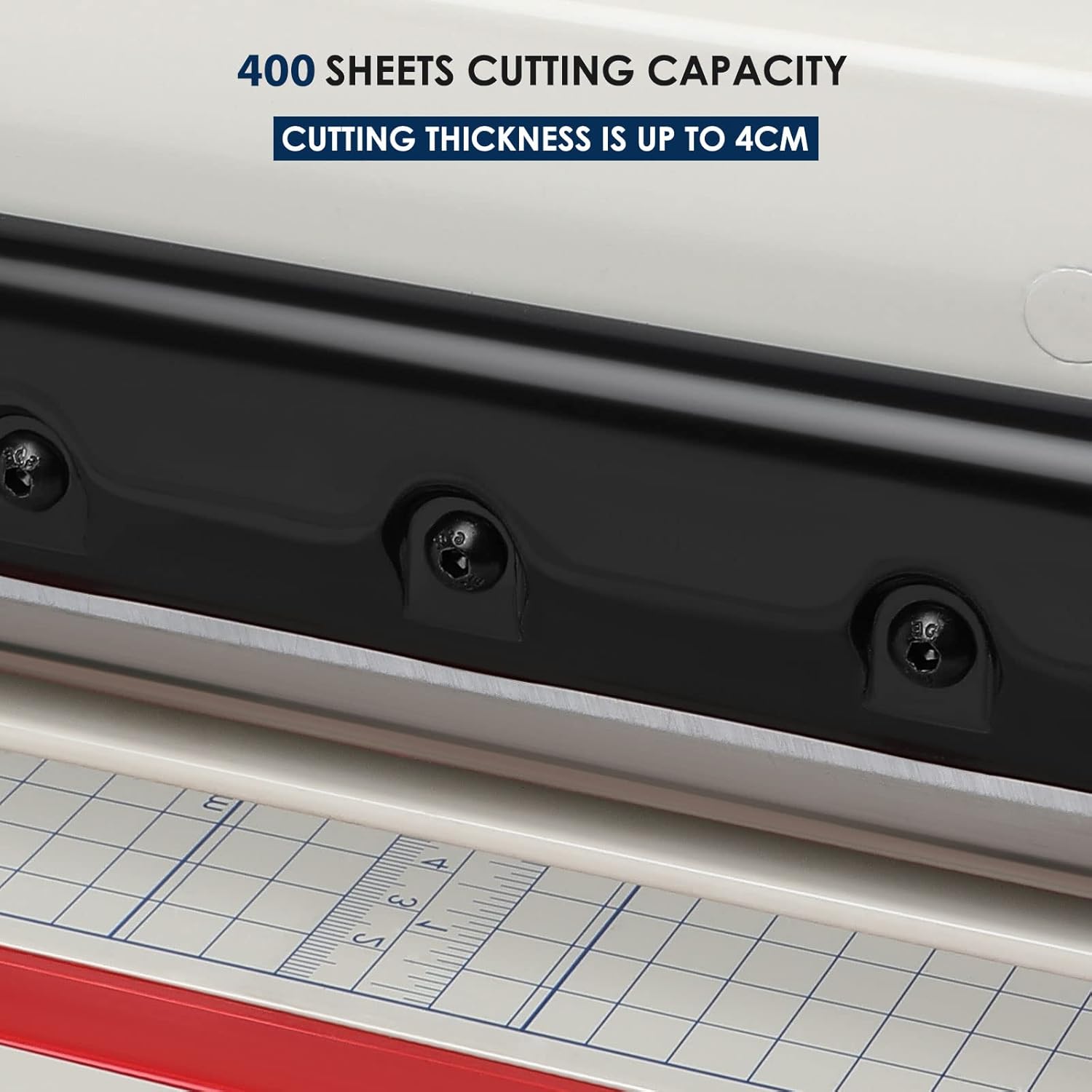 - 【400 Sheets Cutting Capacity】 ---cutting thickness is up to 4cm. The maximum cutting volume is 400 sheets of paper for more efficient cutting. The guillotine paper cutter can not only cut paper business card books and leather, but also cut bubble film fabric film pearl cotton etc.