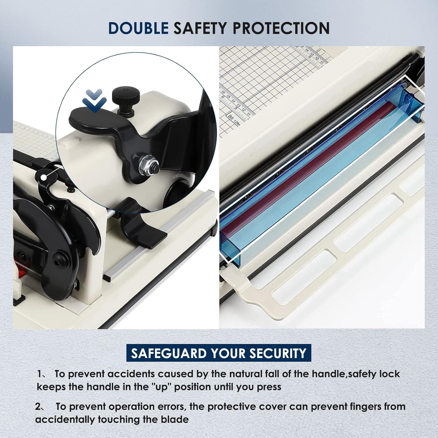 - 【DOUBLE SAFETY PROTECTION】Safety lock and protective cover give you double safety protection. Press the safety lock, the paper cutter can be used; the blue protective cover can not only prevent foreign objects from entering, but also prevent fingers from entering the blade.