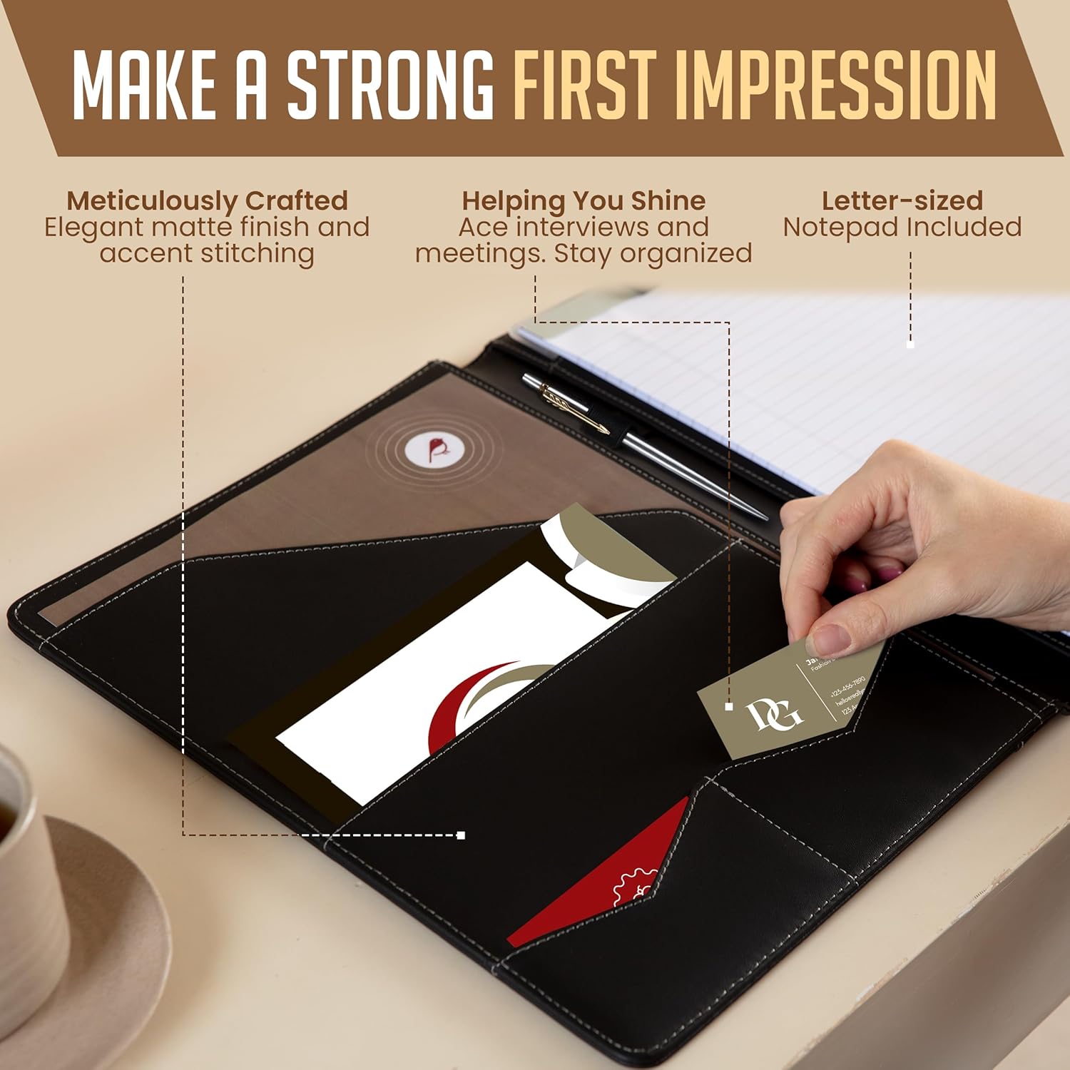- โ SLEEK & PROFESSIONAL: Make a strong first impression with this modern portfolio with a classy piano black matte finishing. This faux leather folder is water resistant and fits most briefcases & bags, making it the ideal padfolio for women and men.