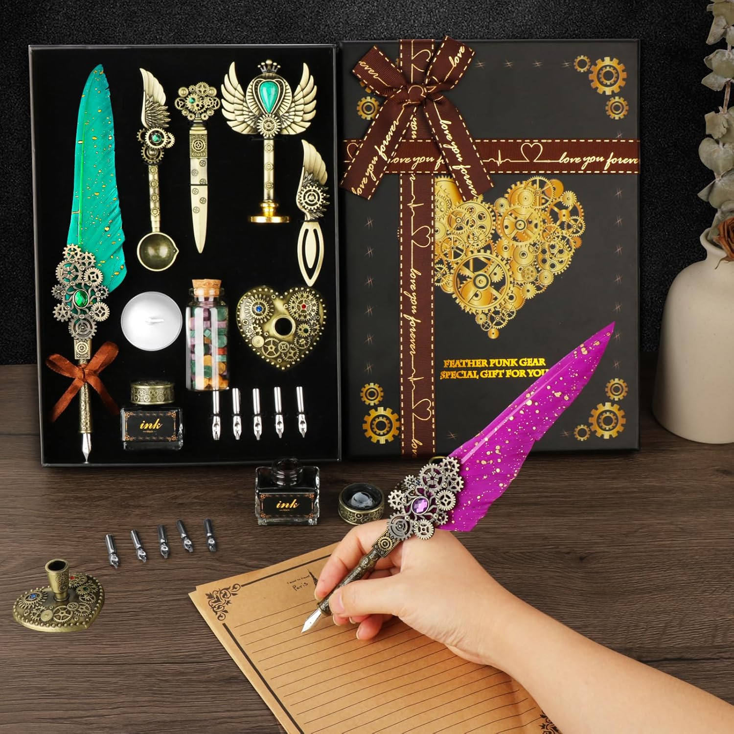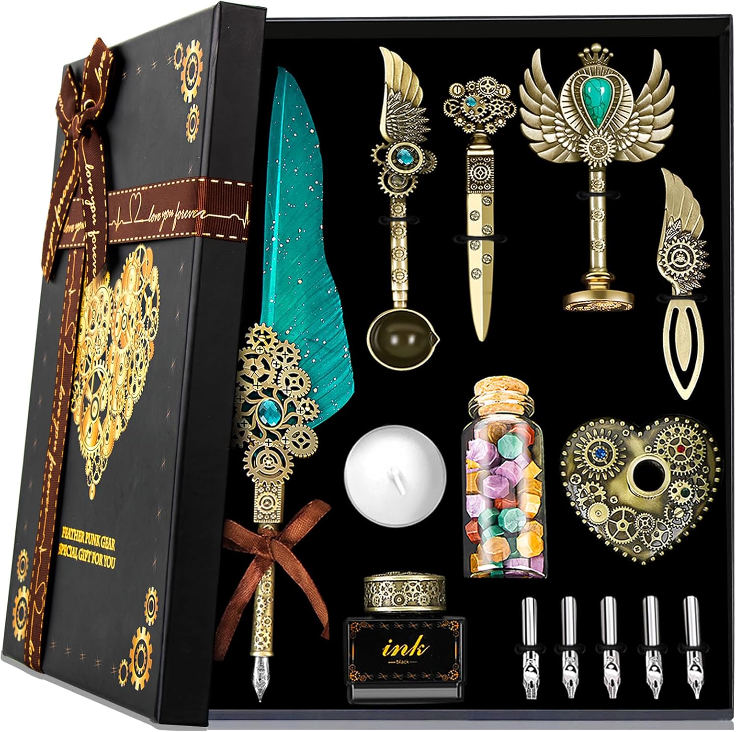 - 【Feather Pen Set Includes】1* quill pen,1* ink(Black),1* love pen holder,5* replaceable stainless steel nib,1* envelope,1* letter paper,1* bookmark,1* "gear design" Seal,1*color wax beads, 1*white wax,1*melting wax spoon,1*envelope opening tool,1*mechanical punk packaging box
