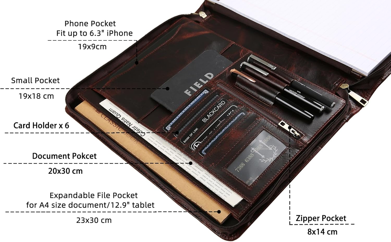 Personalized Leather Portfolio Organizer for IPad/Document, Business Padfolio with A4 Leather Notepad Holder, Custom Leather Compact Folder Conference Portfolio for Men and Women, Oil-Red Brown