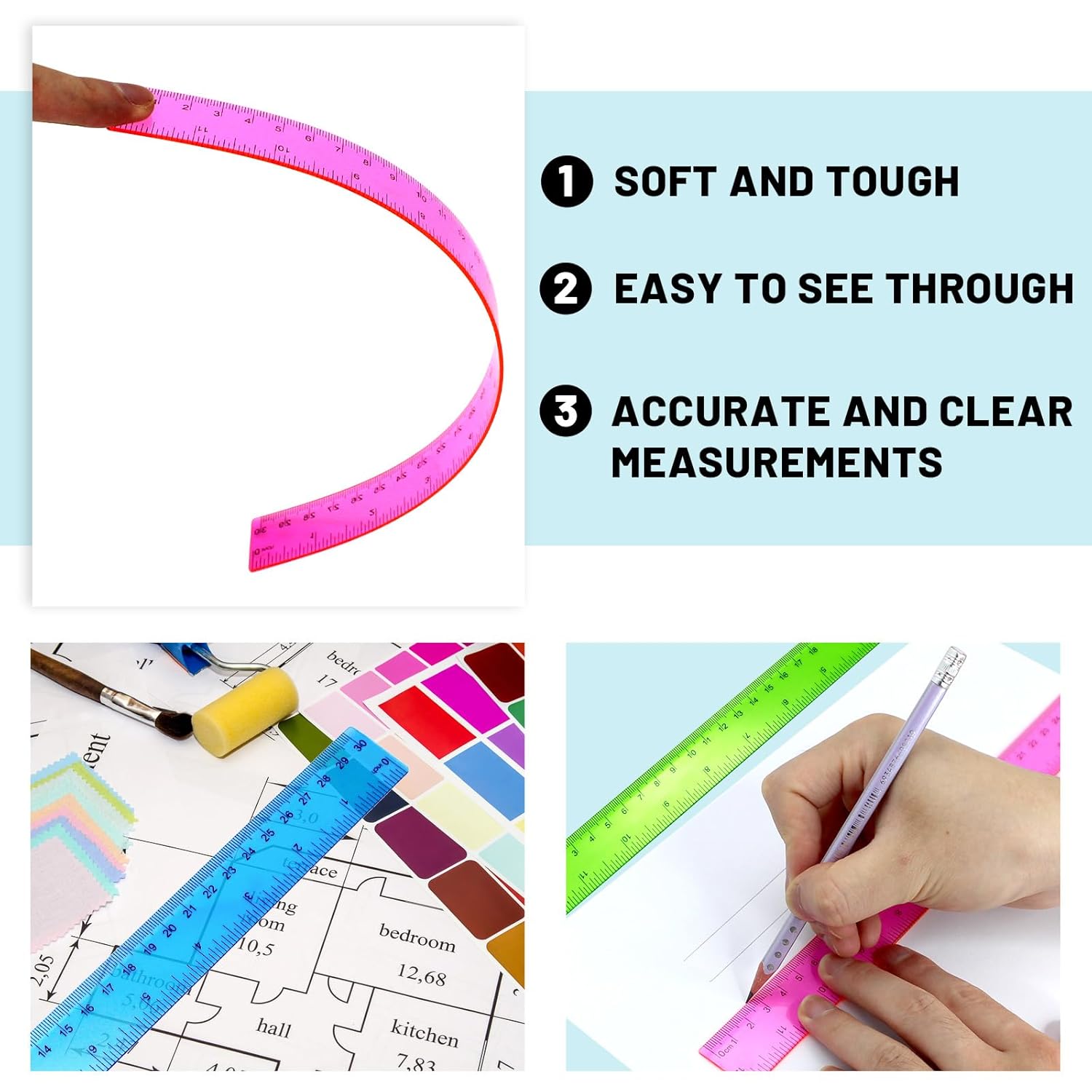 - 【6 Assorted Color Plastic Rulers】The Clear ruler's size is 12 inches/30 centimeters and is made of transparent plastic. Six colors - pink, transparent, blue, red, green, and yellow - will meet the preferences of most people. Children and students will also be happy because they have so many cute acrylic rulers to choose from.