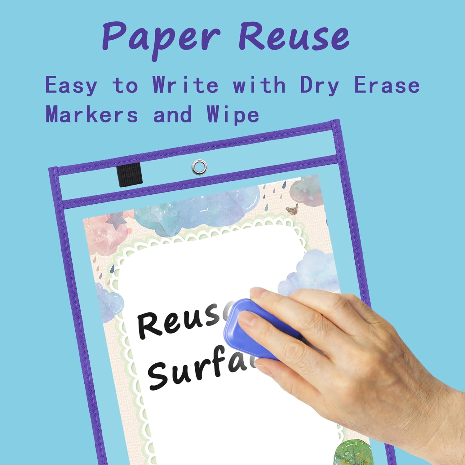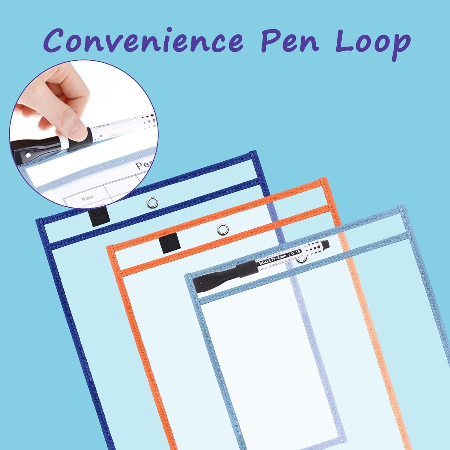 - Convenient design: you can keep dry erase markers in pen loop on sheet protectors top, and 0.32" eyelet at the top for easy hanging or bundling on wall or student desk