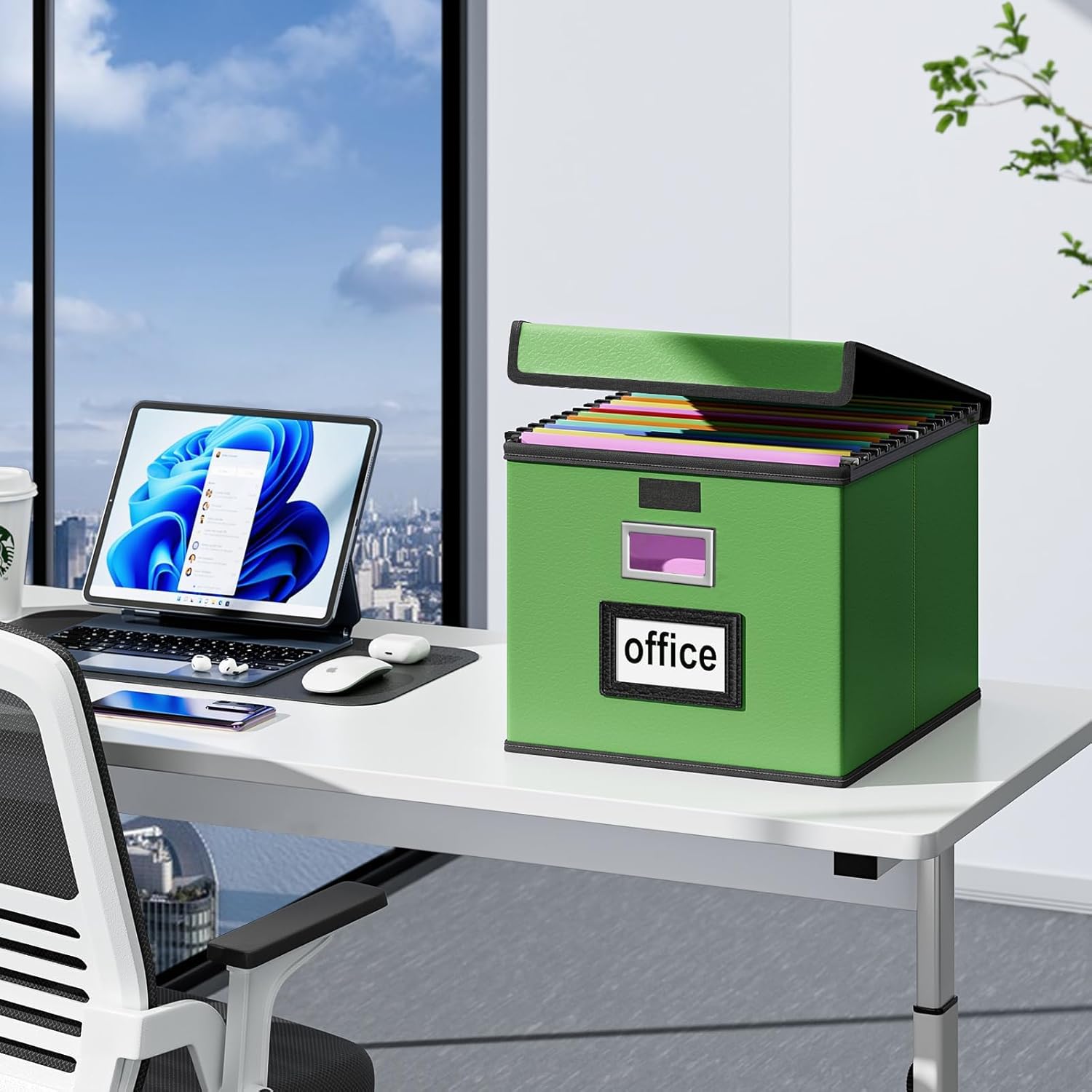 Huolewa File Organizer Box with Lid, Collapsible Faux Leather Document Organizer, Hanging File Folder Box with Plastic Slide, Decorative Filing Boxes Cabinet for File and Folders Storage(Green)