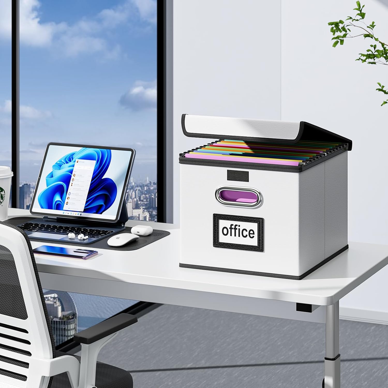 - Portable Filing File Cabinet for Home/Office- The outer box with leather can be dustproof, inside and the bottom support is made of thickened cardboard, which is environmentally friendly and not easily deformed. The cover with Velcro not only allows us to cover the file box easily, but provides more storage space for the file and folders. It also acts as a small filing cabinet for tax documents, legal files and other documents storage. When we are not using it, we can fold it up to save space.