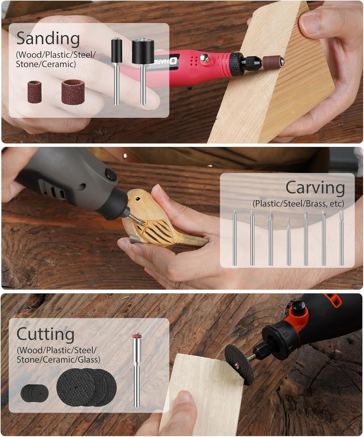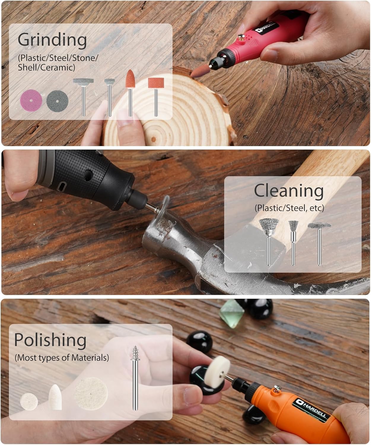 - 【227pcs Complete Rotary Tool Accessories】The wealth accessories include sanding bits, diamond grinding drills, cut-off wheels, steel brushes, felt wheels, grinding wheels, mandrel, and 3 collets (1/8), perfect for sanding, engraving, polishing, cutting, grinding, and cleaning. Unleash your creativity and take your DIY projects to the next level with the HARDELL Complete Rotary Tool Accessories Kit.