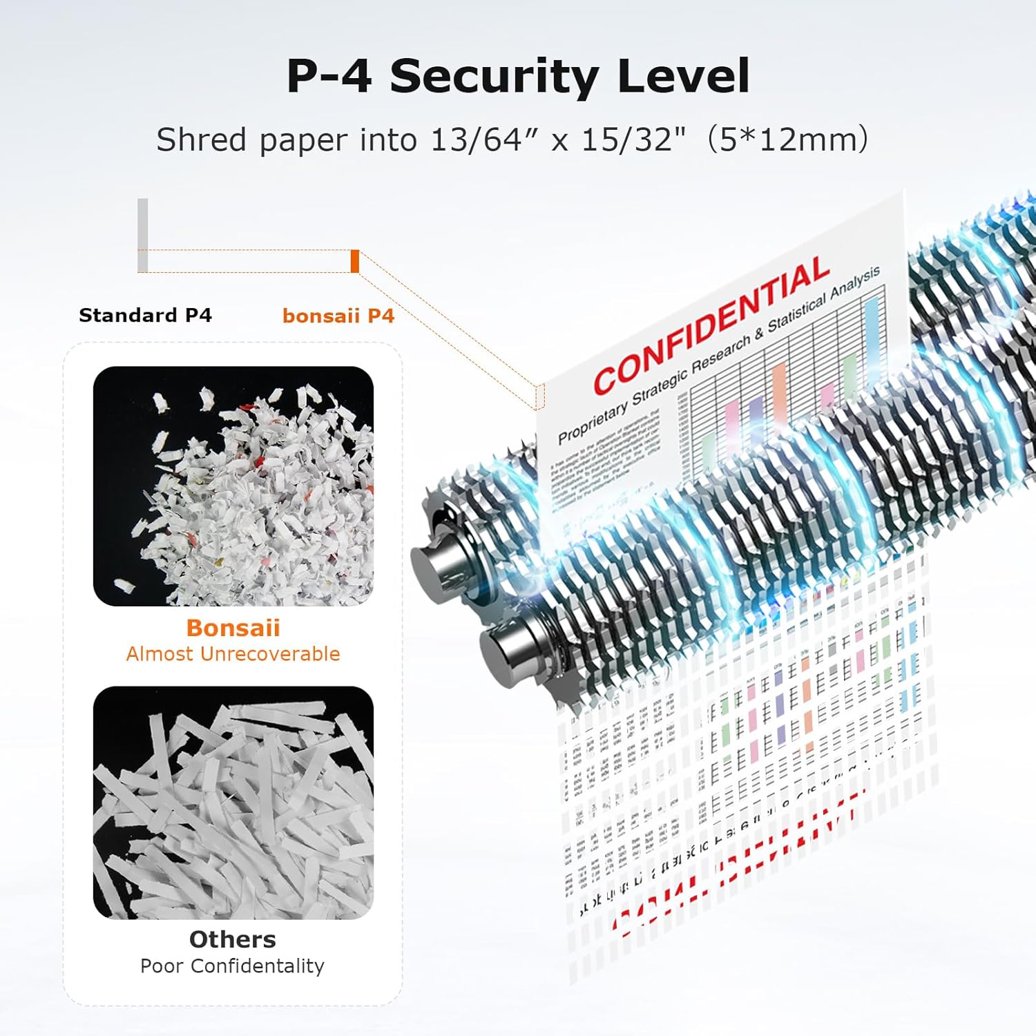 - 【P-4 High Security】Micro-Cut shredder can shred paper into tiny particles of 13/64″ x 15/32"(5*12mm), security level P-4, which better protects your personal privacy. 60dB low noise running this shredder is very suitable for office, small office or home office.
