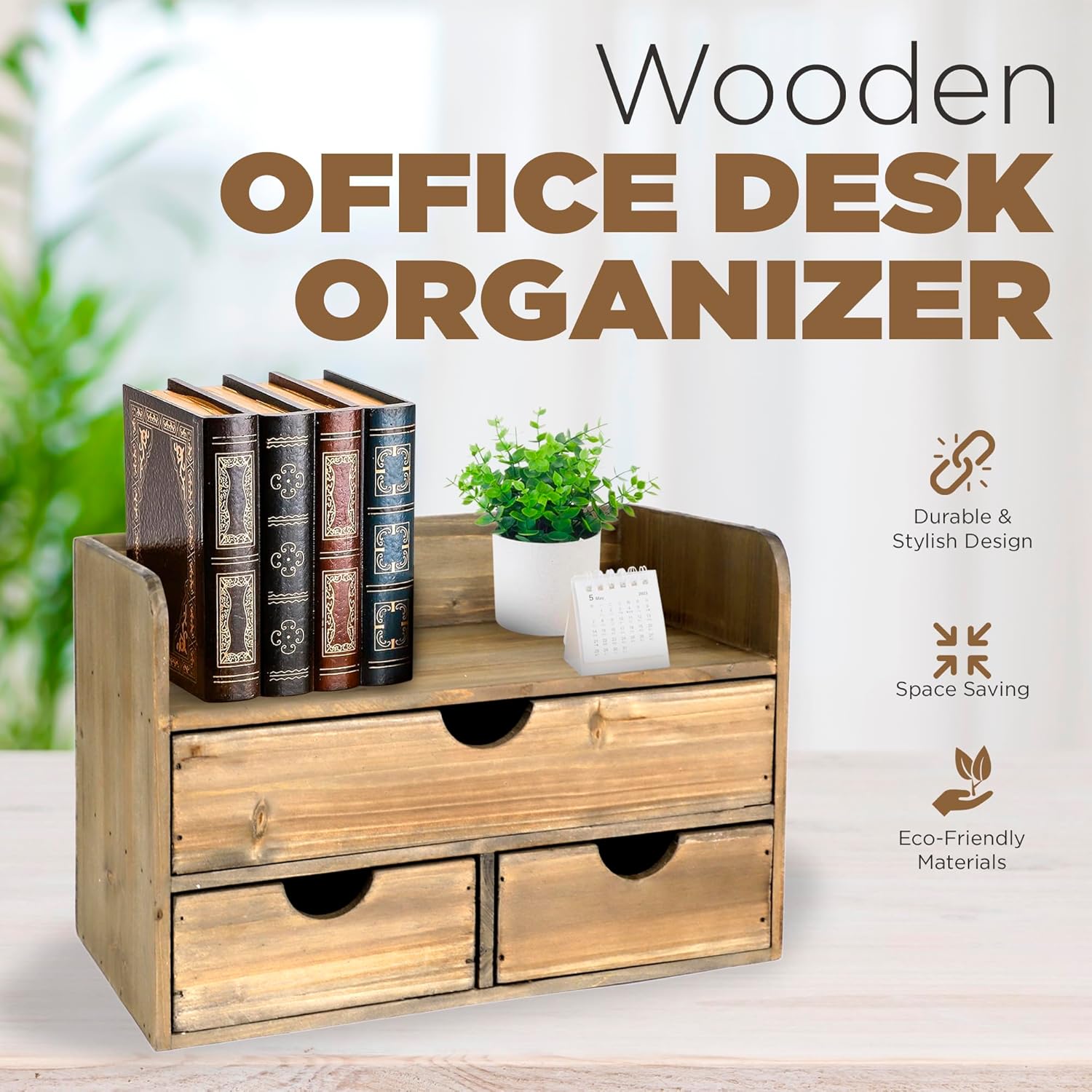 Besti Wooden Office Desk Organizer - Organizing Tool for Desktop, Cubicle, Bedroom, Kitchen - Vintage Style Organization Caddy with Top Tray Shelf & 3 Drawers - 13.6x9x7 Inches (Rustic Burnt)