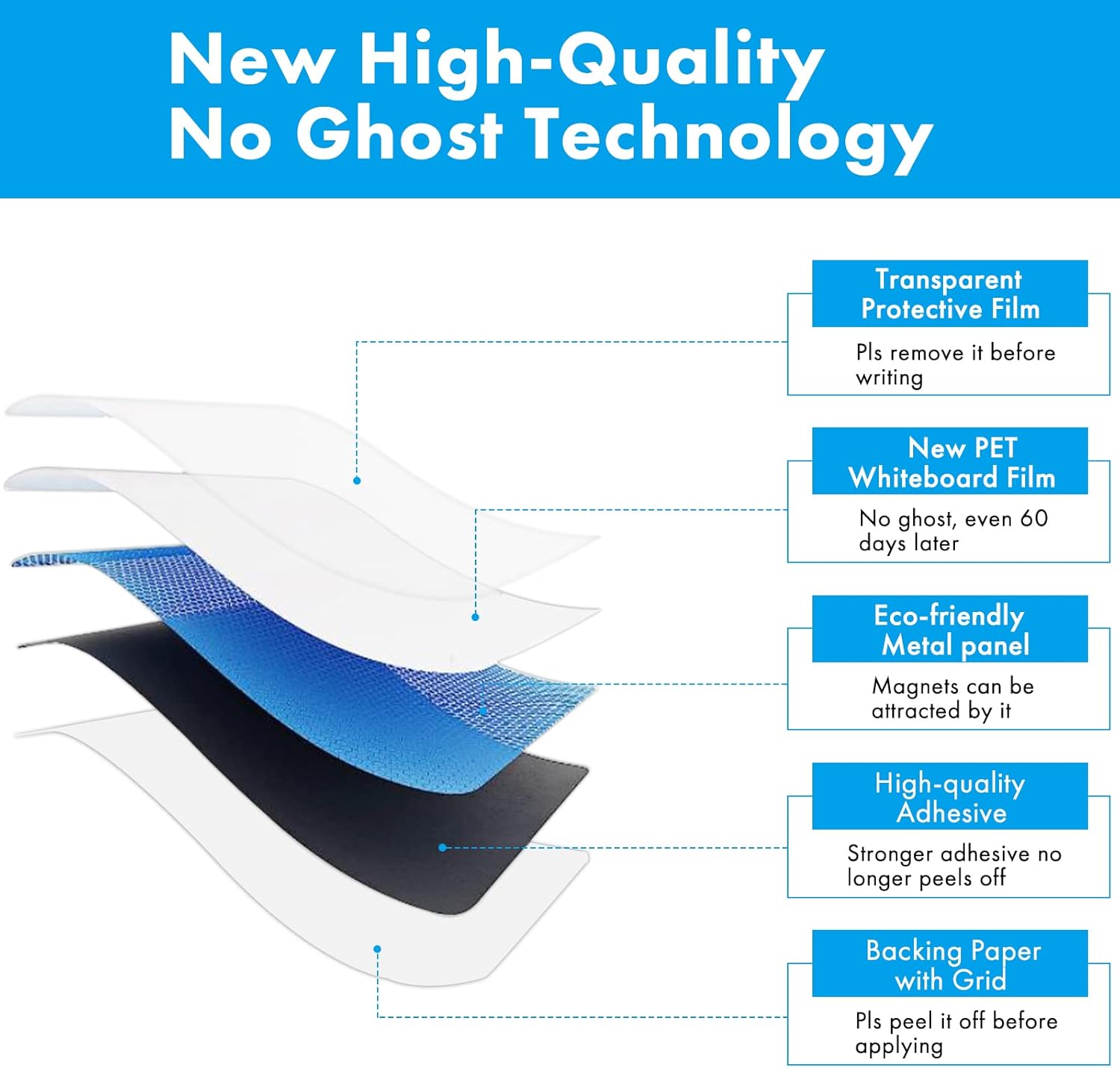 - NO GHOST β Upgraded the stain-resistant technology, even if leave drawing on it for 60 days, they still erase with ease. NOTE: pls REMOVE the TRANSPARENT PROTECTIVE FILM on the whiteboard before using it.