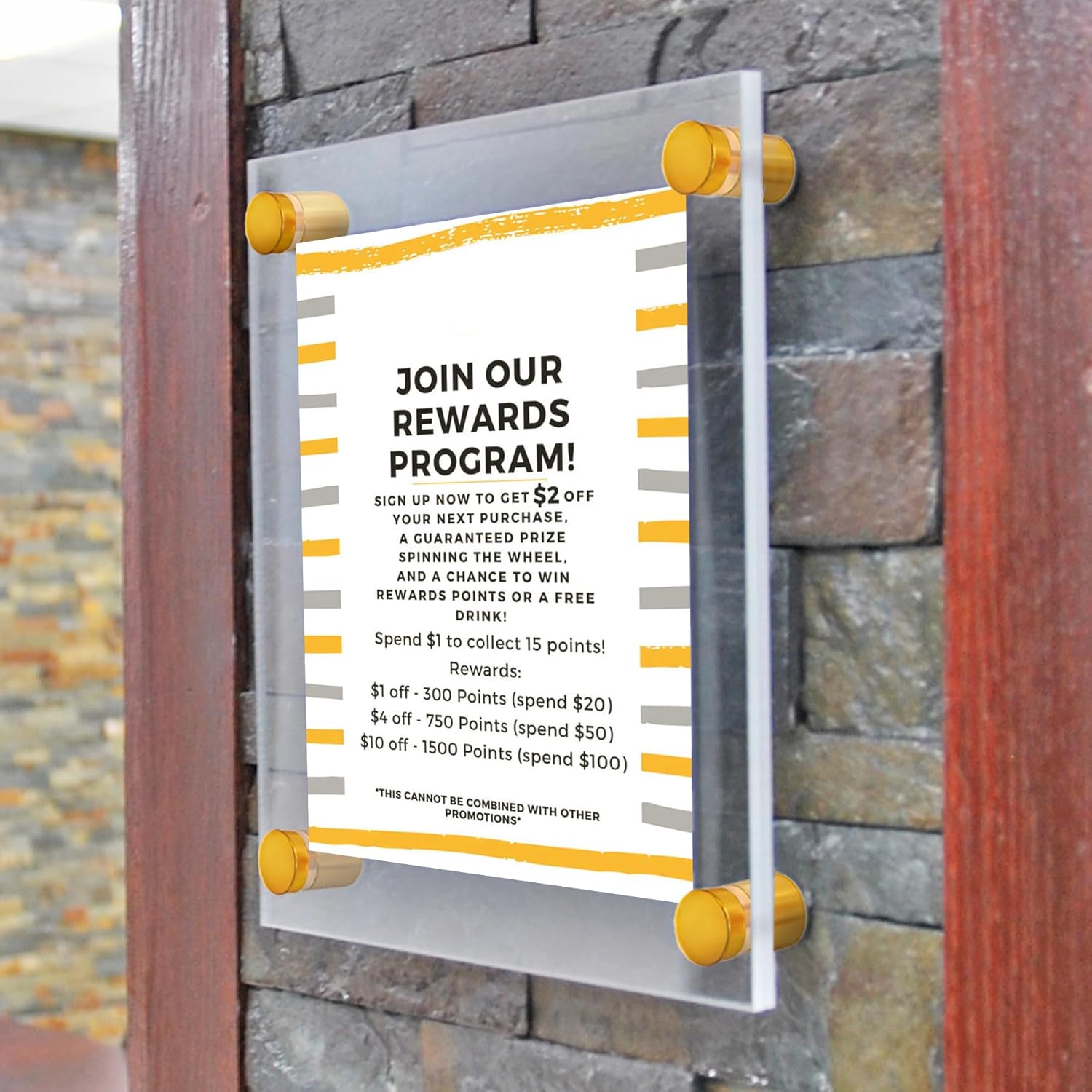 - โ HARDWARE INCLUDED - Each floating sign holder frame set includes 2 acrylic panels that are 3/16โ thick, 4 standoff caps and hanging hardware. Note: Large format sizes: 24โ x 36โ and 30โ x 40โ include 6 standoffs and caps.
