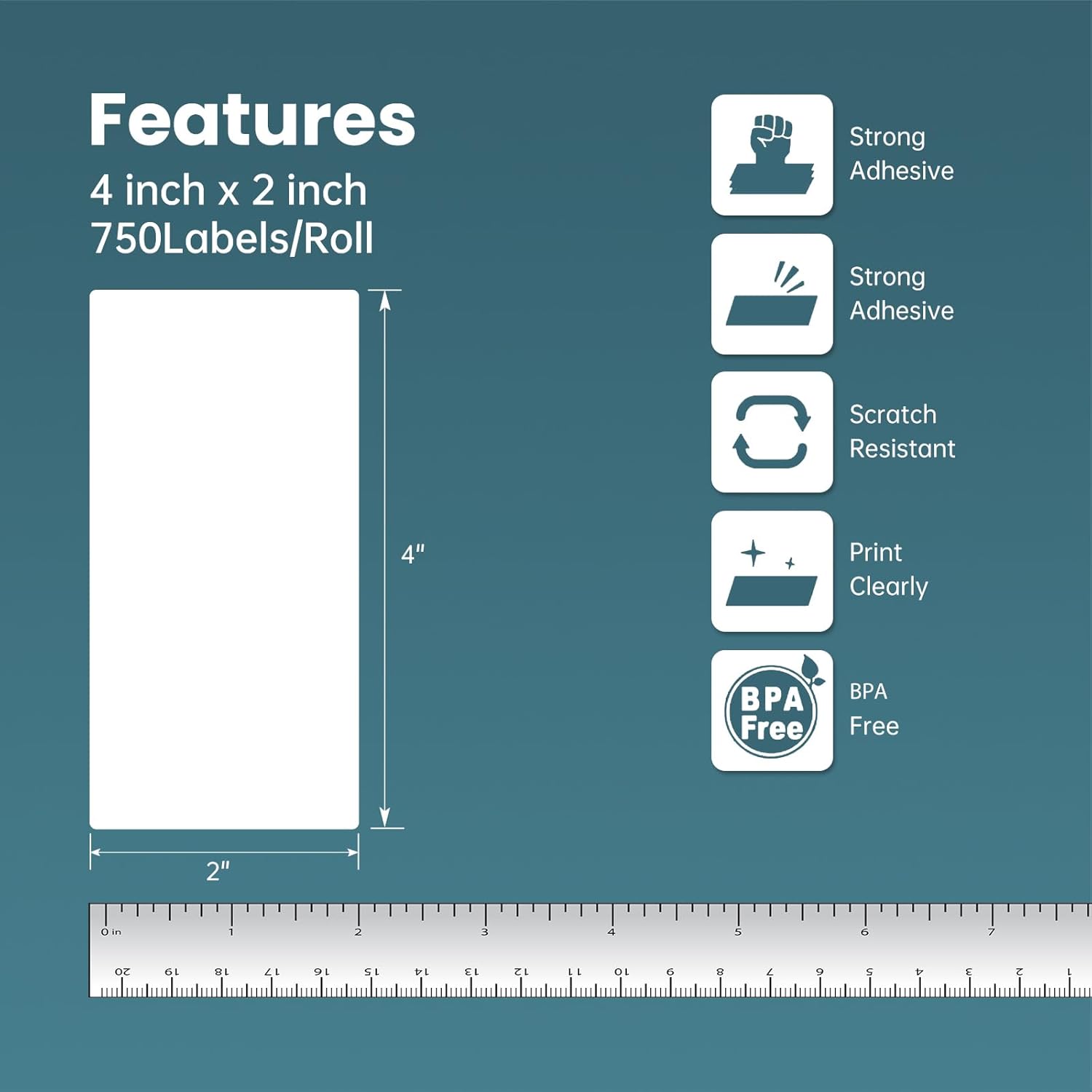 - [ Specifications ]: 4 in x 2 in (102 mm x 51 mm) (750 Labels/Roll, 12 Rolls),Paper tube diameter:1"(25.4mm). No Ink Toner or Ribbons Needed! Save your money and effort.