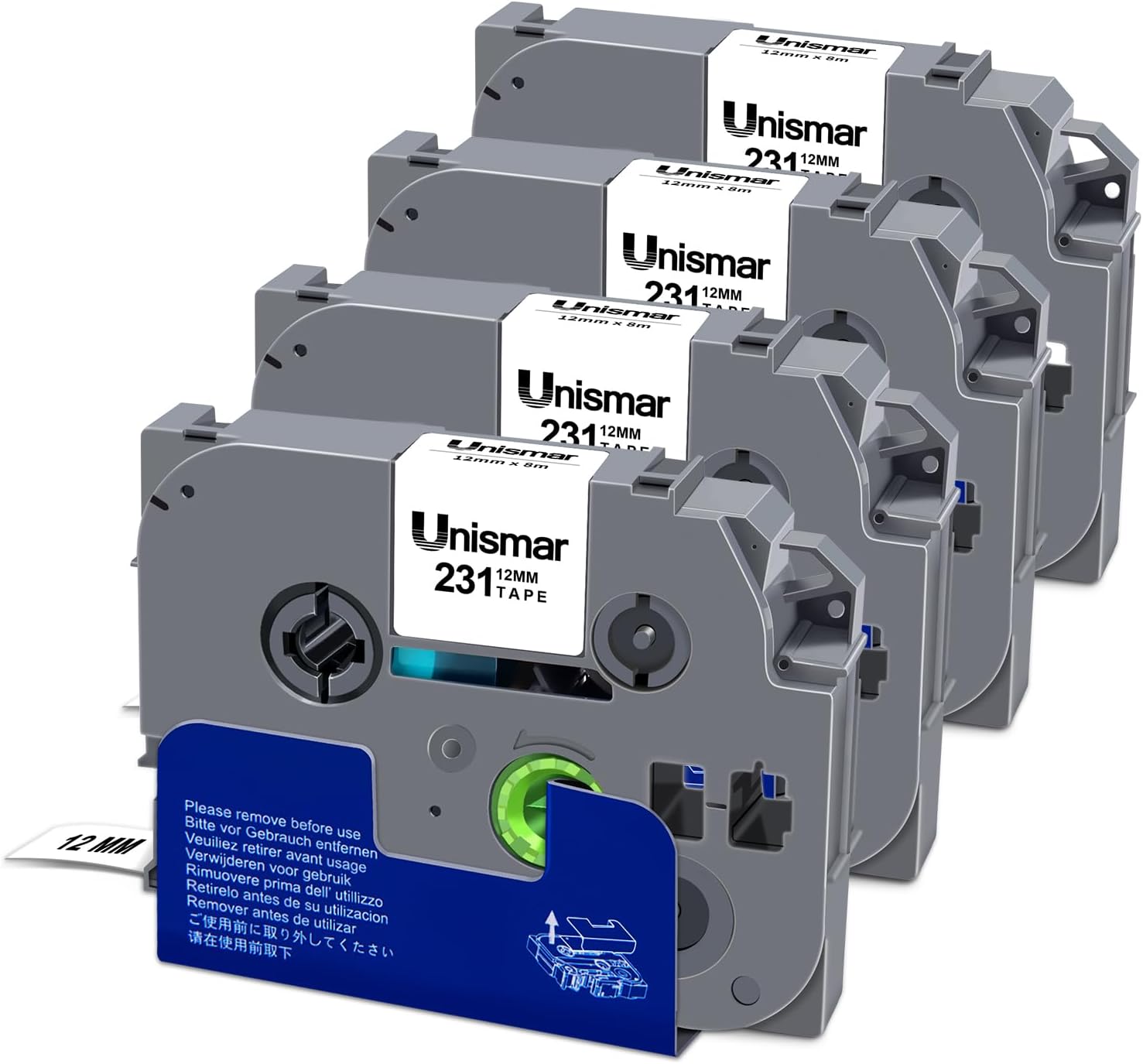 4-Pack TZe-231 Compatible for Brother P Touch Label Maker Tape TZe 12mm 0.47 Laminated White TZ-231 TZe231 Label Tape Refills for Ptouch PTD220 PT-D220 D202 D210 D600 D400 H100 H1101280 Label Maker