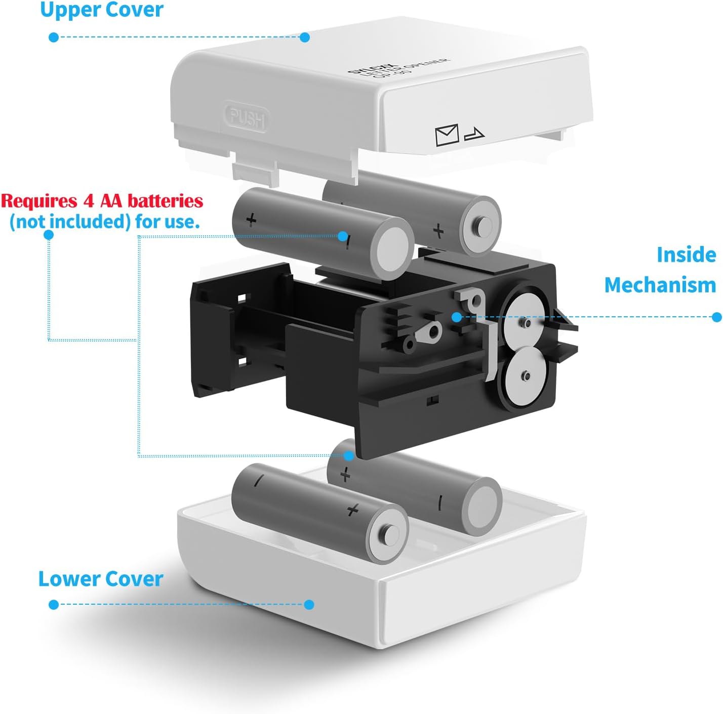 - Letter opener requires 4 AA batteries (not included). Install the 4 AA batteries in the correct way: 1, Hold the lower cover with your left hand, press the "PUSH" buttons on both sides of the upper cover firmly with your right hand. 2, Take out the internal structure, put 2 AA batteries on the front side of the internal structure (make sure of the +/- direction), and put 2 AA batteries on the reverse side of the internal structure. 3, Put on the upper and lower covers and start working