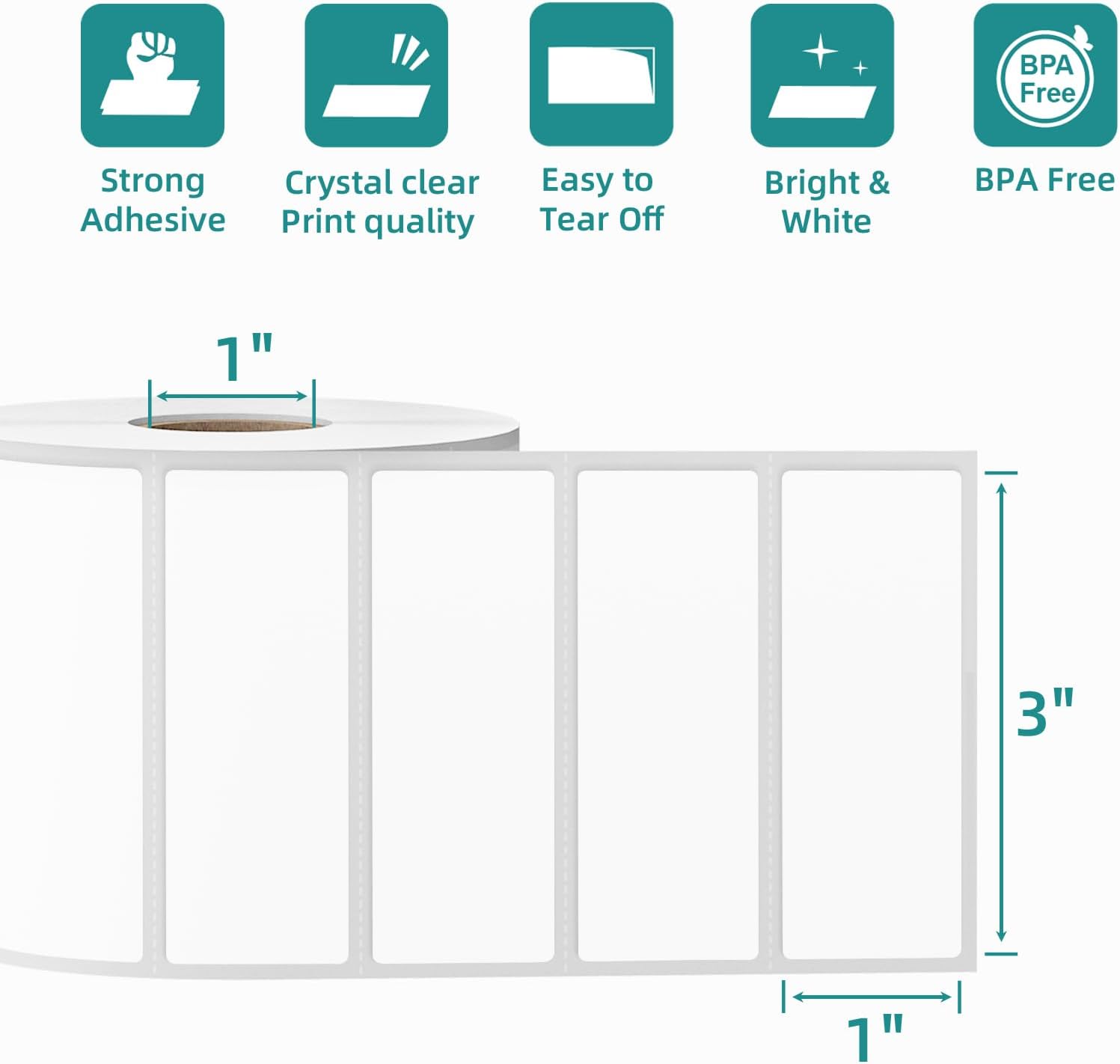- 3 x 1 inch Direct Thermal Labels - 1” Core, 12 Rolls / Case, 1300 Labels / Roll, total 15600 labels. Compatible with Direct Thermal Desktop Printers.