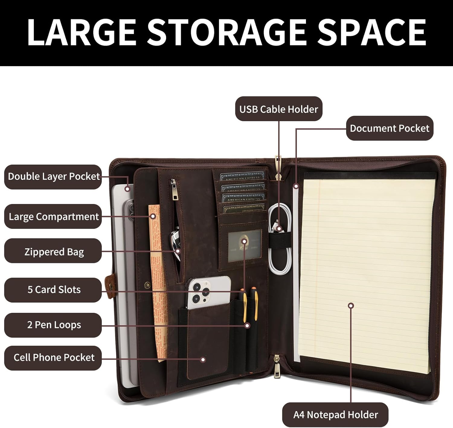 - Ultimate Organization Companion: Spacious compartments for documents. Inside YKK zippered pocket for secure storage. 5 convenient card slots, 2 pen loops for quick access, a dedicated cell phone pocket, and even a USB cable holder. Stay impeccably organized and make a powerful statement in any business setting.