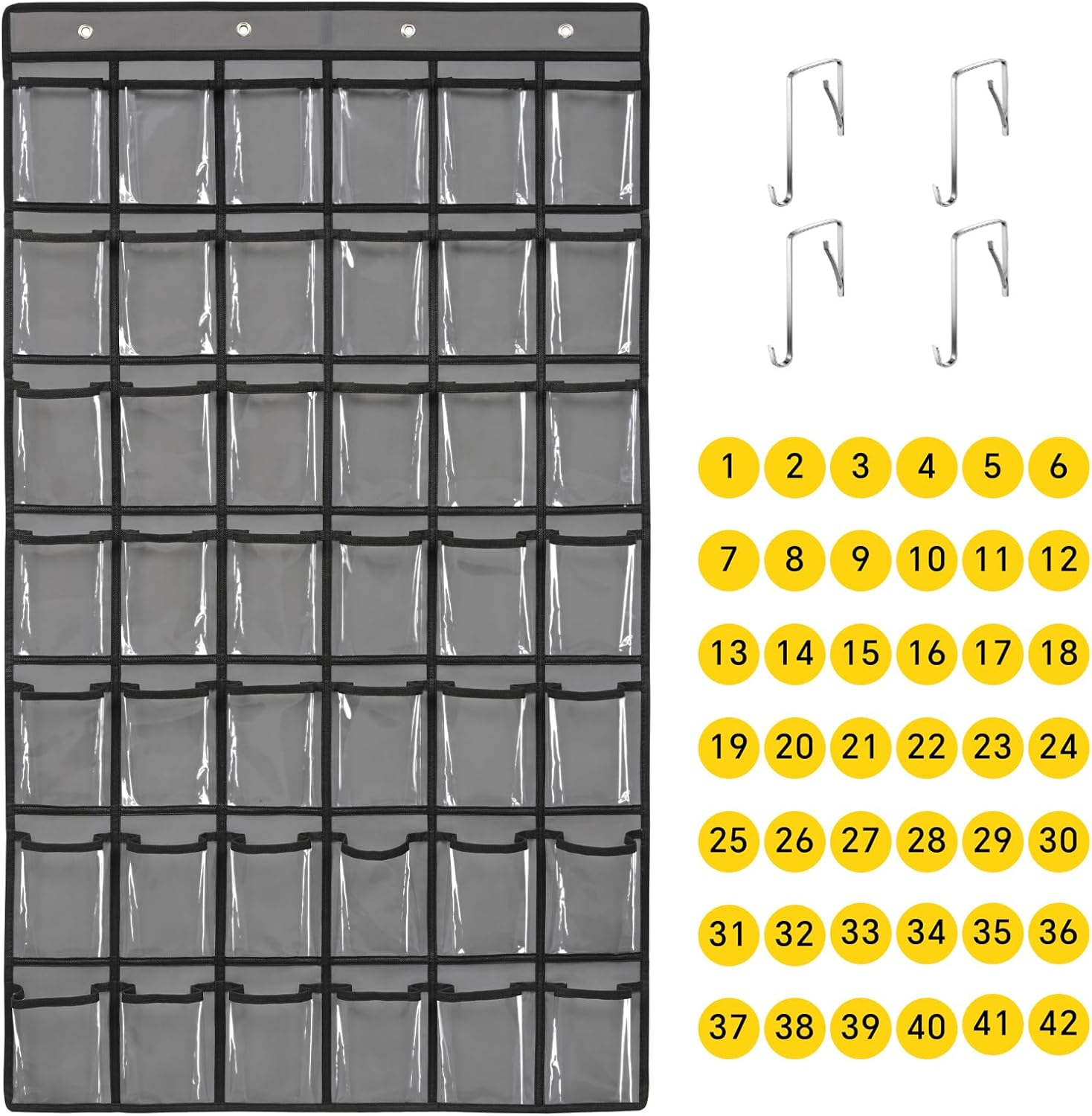 - 🍀【1-42 free number stickers】There are 42 free number stickers for the clear hanging pocket organizers. Each pocket has a number, helps you find your cell phone quickly, save your time.