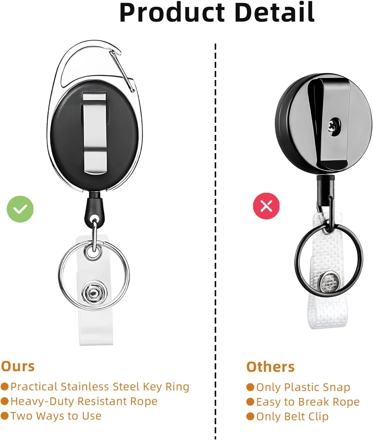 - Premium materials: Made of wear-resistant polyester retractable fiber cord, sturdy plastic reel case, and metal key ring and clip, these retractable id badge reels are built to last. The compact and sturdy fiber cord has a retraction force of up to 4 oz/113g
