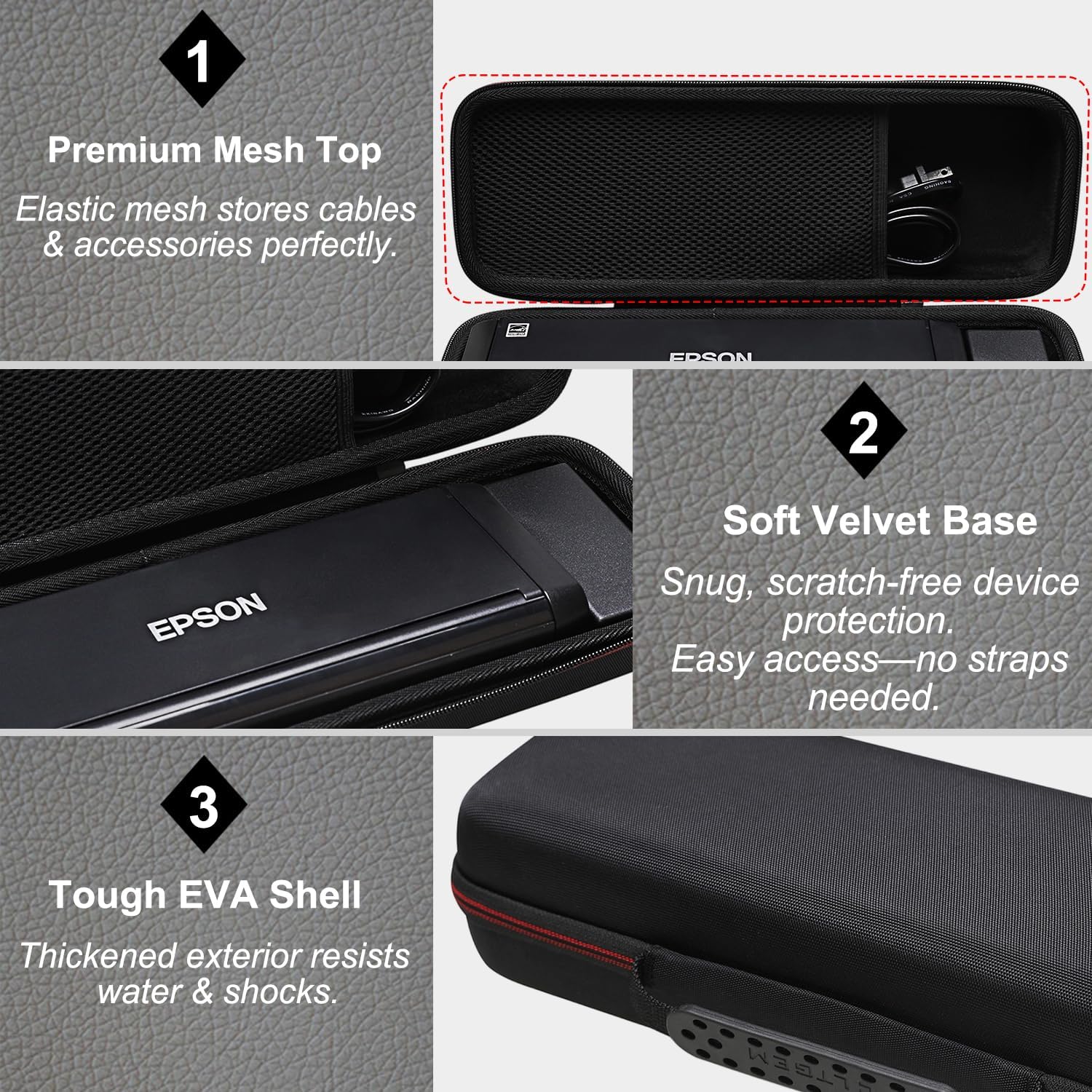 - CONVENIENT DESIGN: This design features an inner mesh pocket for accessories and a dedicated space for the power adapter. The interior is custom-shaped to securely hold the Epson Document Scanner, eliminating the need for elastic bands or partitions. This reduces weight and allows for quicker, more efficient access and storage. A smooth 360-degree zipper ensures effortless operation.