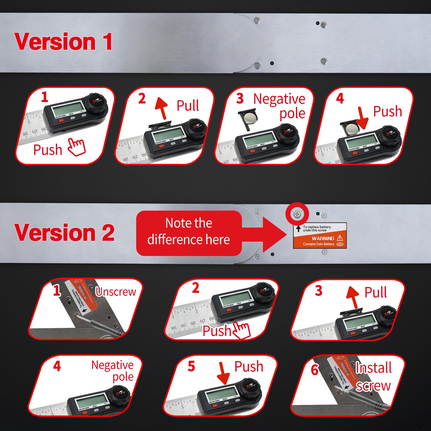 - Note: There are two versions of this Angle measuring tool. Please check whether there is a screw on the back that needs to be removed before installing the battery