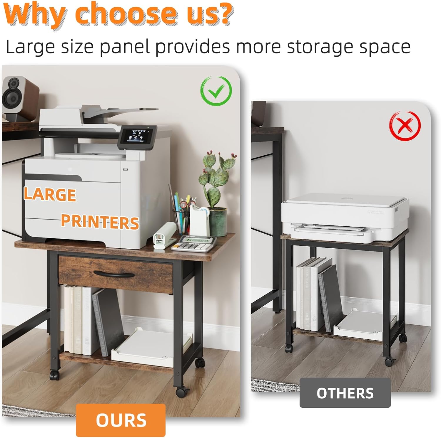 - 【Large Printer Stand】Size:22"L×15"W×15.8"H. Large spacious tabletop can fit most printers: fax machines,3D printers,scanner and other office supplies. Not only a printer stand for desk, you can use it as a end table for the bedroom,living room, and a desktop organizer for your kithcen, office.