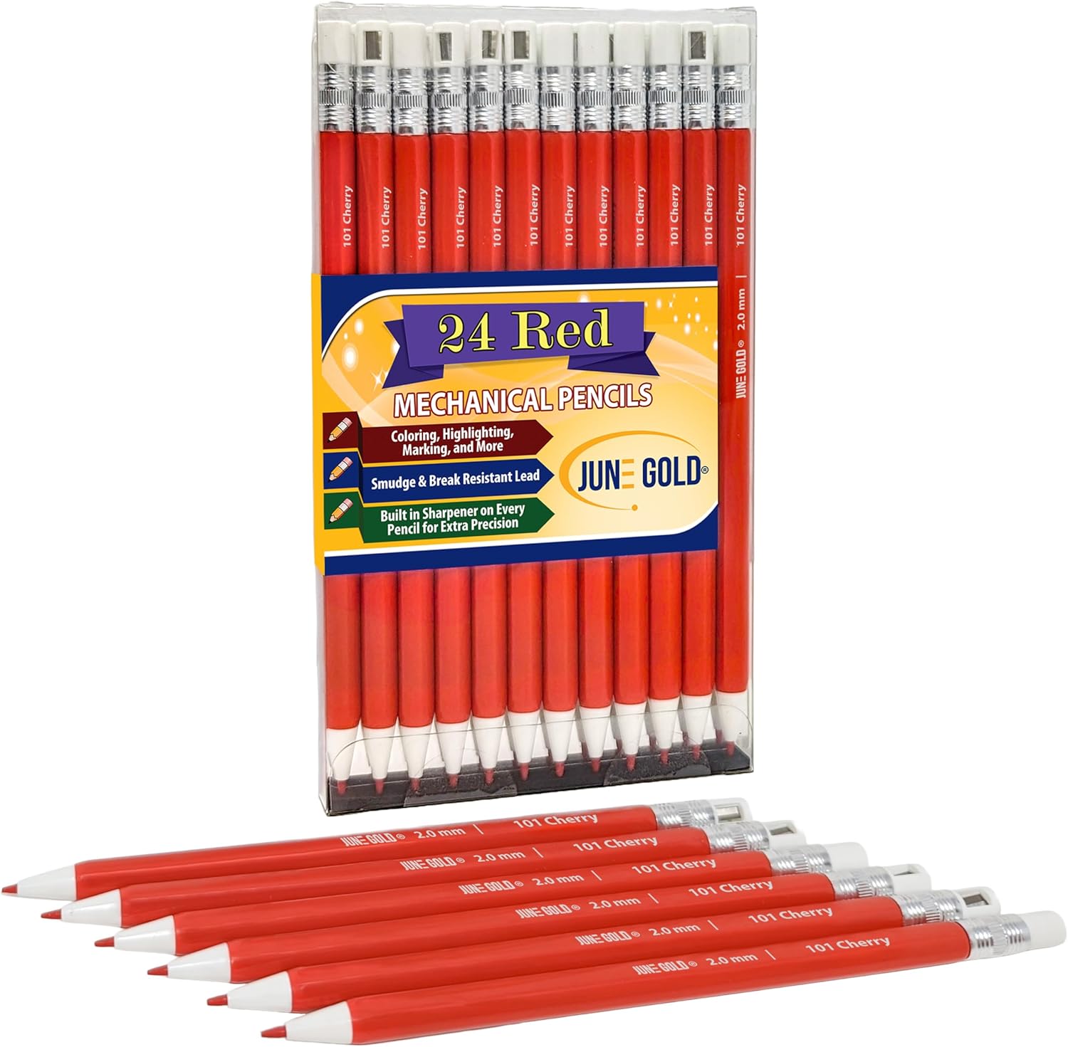June Gold 24 Red 2.0 mm Mechanical Pencils with Red Color Leads, Bold Thickness, Built in Rear Sharpener (Cherry #101)