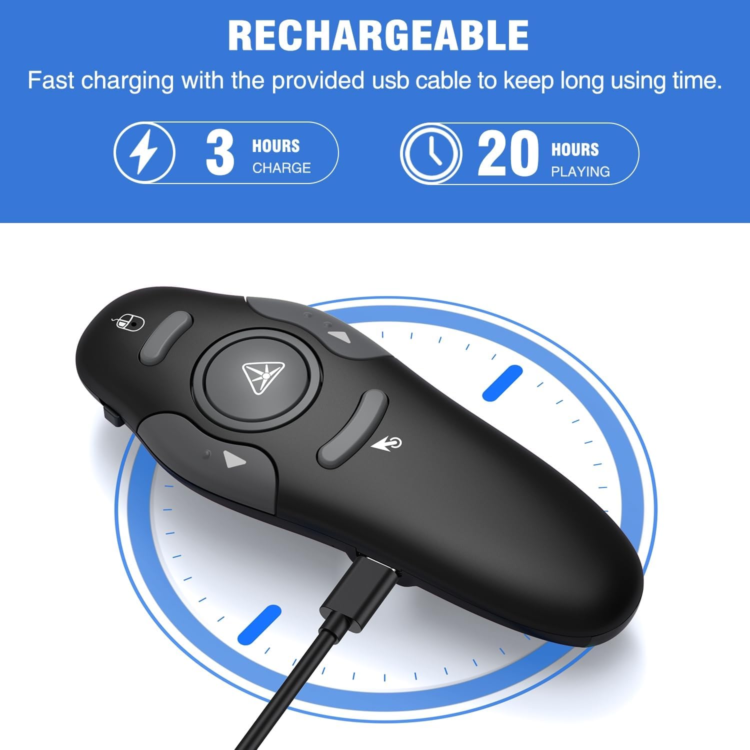 - 【Long Battery Life with Rechargeable Function】 With its built-in 300mAh rechargeable battery, simply charge for 2.5 hours to enjoy weeks of use. The powerpoint clicker automatically enters sleep mode and turns off when not in use, conserving power
