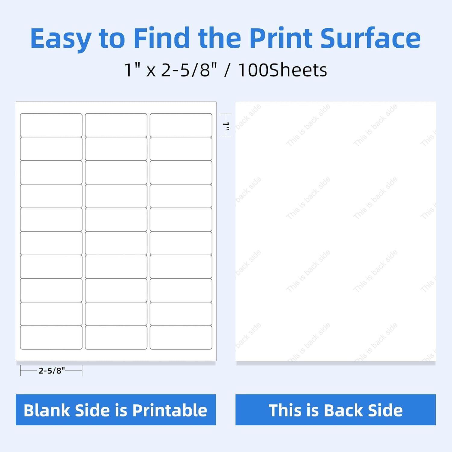 - Labels Size: Label Size: 1" x 2-5/8". Total 100 Sheets = 3000Labels, Color: matte white.