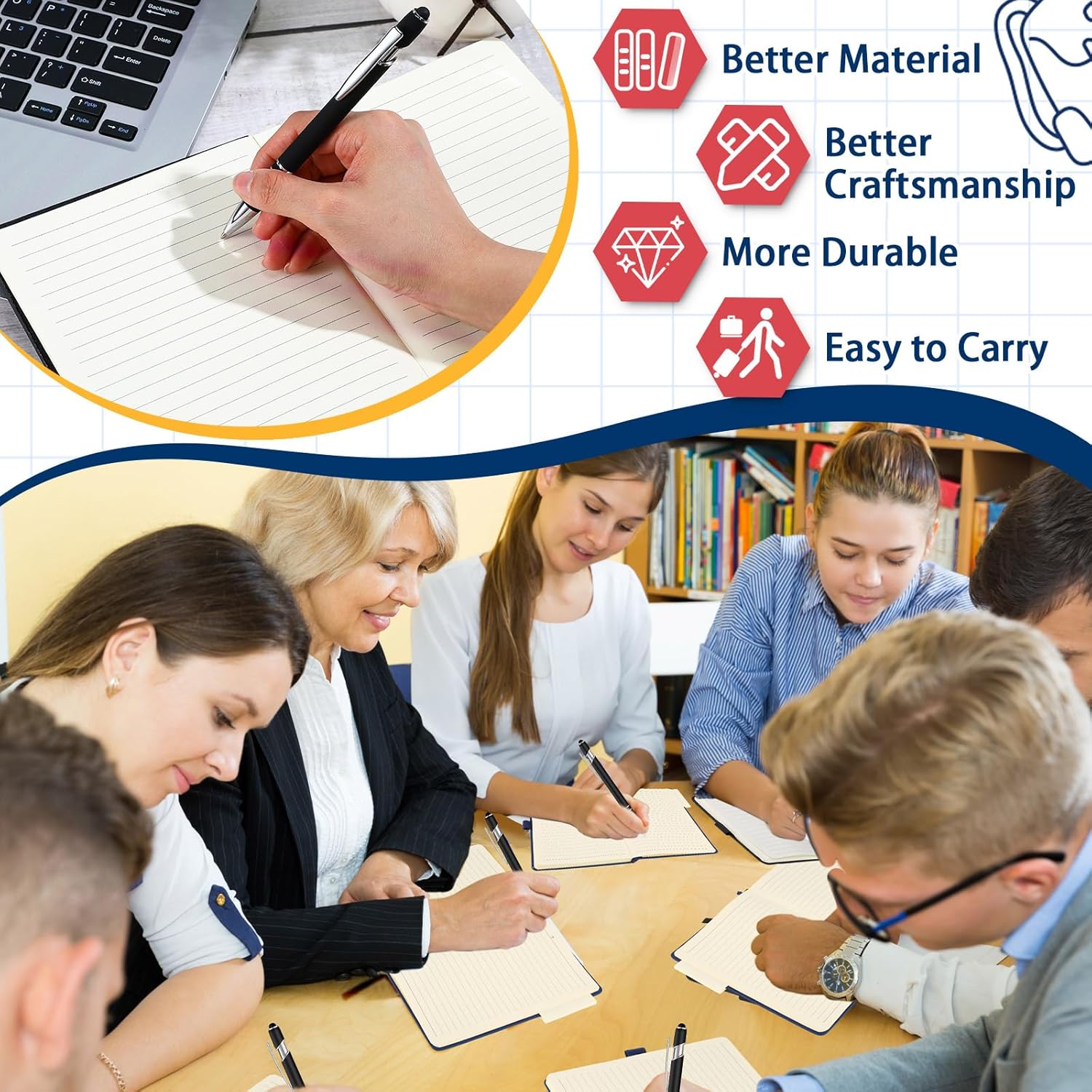 - Retractable Pens: these pens fit into the pen holder of the classic lined notebook; The large tube has the ability to hold more ink, making them long lasting and quick dry, which can avoid smudging, and the other end of the pen can touch the screen