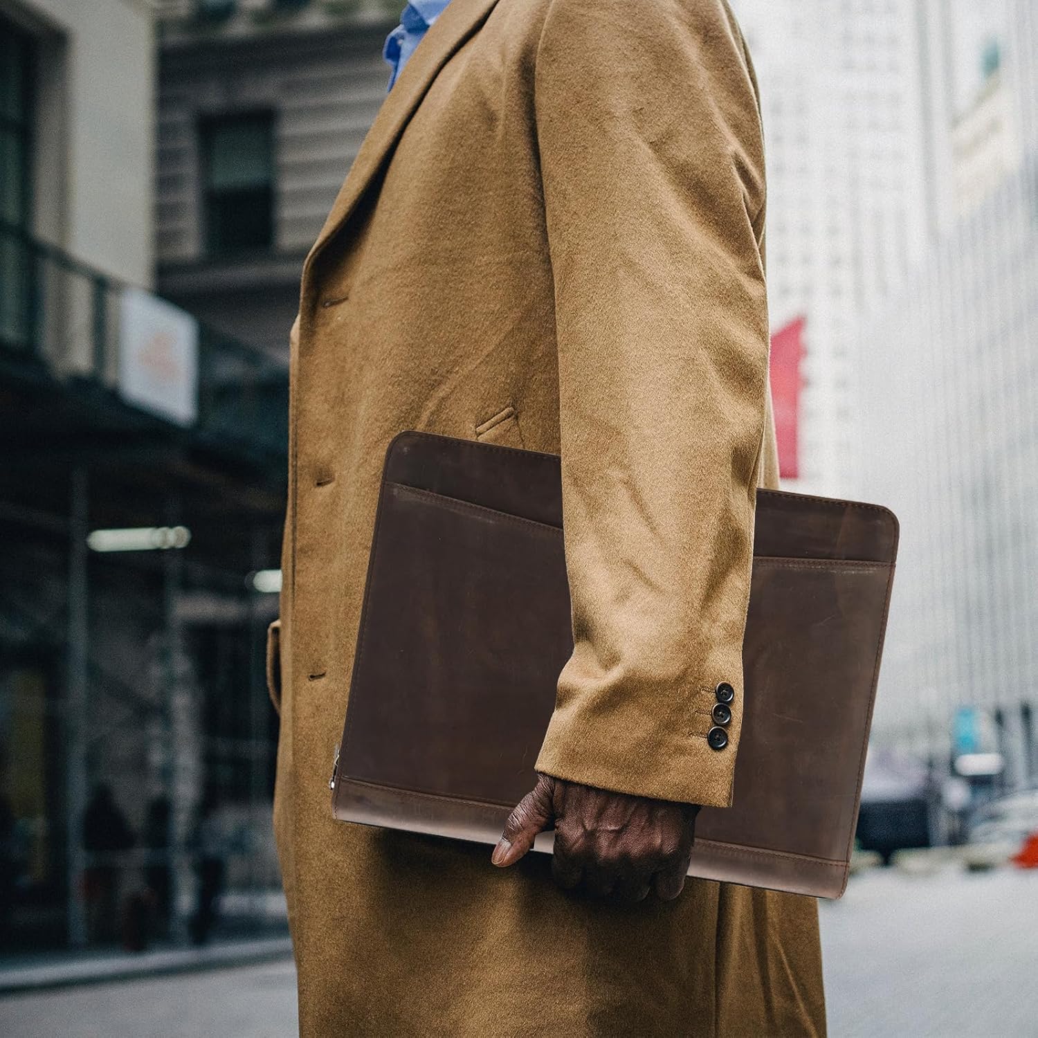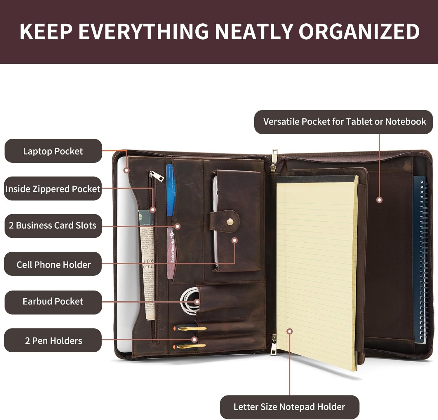 - Effortless Organization: To enhance your daily efficiency, this leather portfolio includes 2 pen loops for easy access to writing instruments, 2 business card slots for networking essentials, an earbud pocket for tangle-free earphone storage, and a dedicated cell phone holder, ensuring all your essentials are readily accessible and neatly organized. Say goodbye to disorganized bags and hello to a more streamlined and efficient workday.