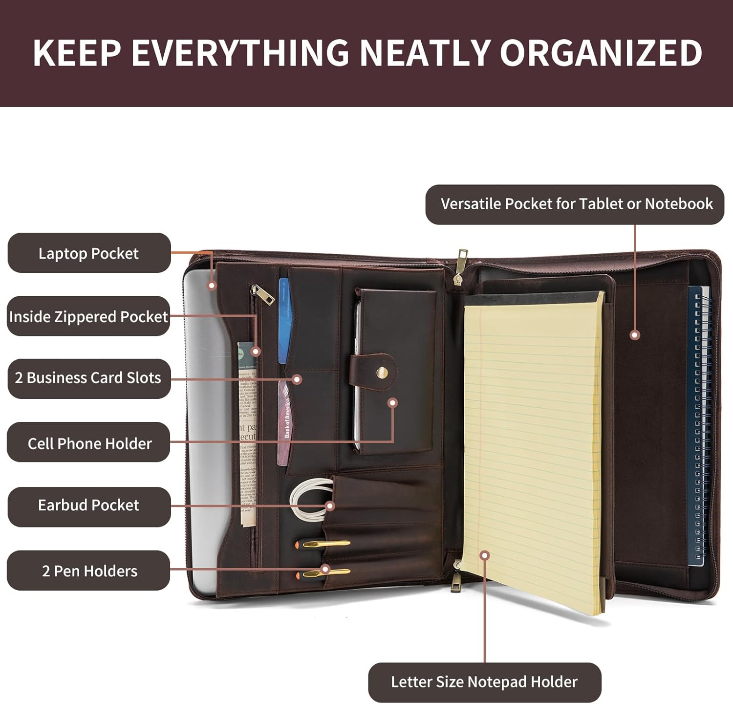 - Effortless Organization: To enhance your daily efficiency, this leather portfolio includes 2 pen loops for easy access to writing instruments, 2 business card slots for networking essentials, an earbud pocket for tangle-free earphone storage, and a dedicated cell phone holder, ensuring all your essentials are readily accessible and neatly organized. Say goodbye to disorganized bags and hello to a more streamlined and efficient workday.