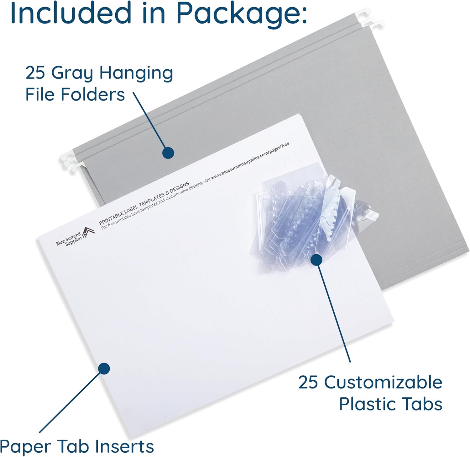 25 Blue Summit Supplies Grey Hanging File Folders Letter Size - Durable 11pt Paper, Hanging File Folders Gray, Plastic Tabs and Inserts Included, Perfect for Office Organization