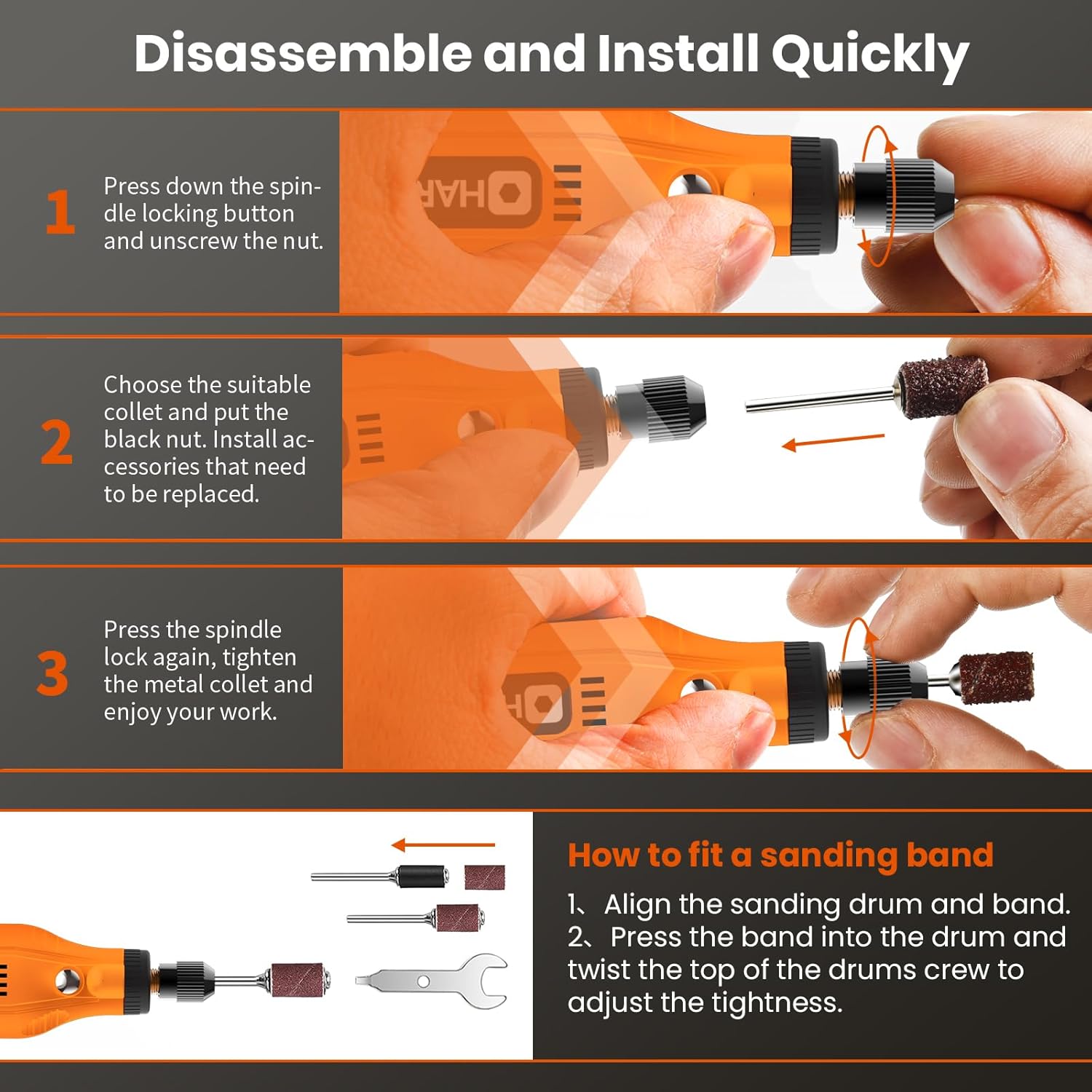 - 【5-Speed Settings】HARDELL mini cordless rotary tool has 5-speed adjustments (5000/8000/11000/14000/18000RPM) for easier speed control and to meet the power demands of different tasks. This allows for safe and careful sanding in stages, even for beginners who can easily control the speed. With the micro rotary tool, your creations are always handy.