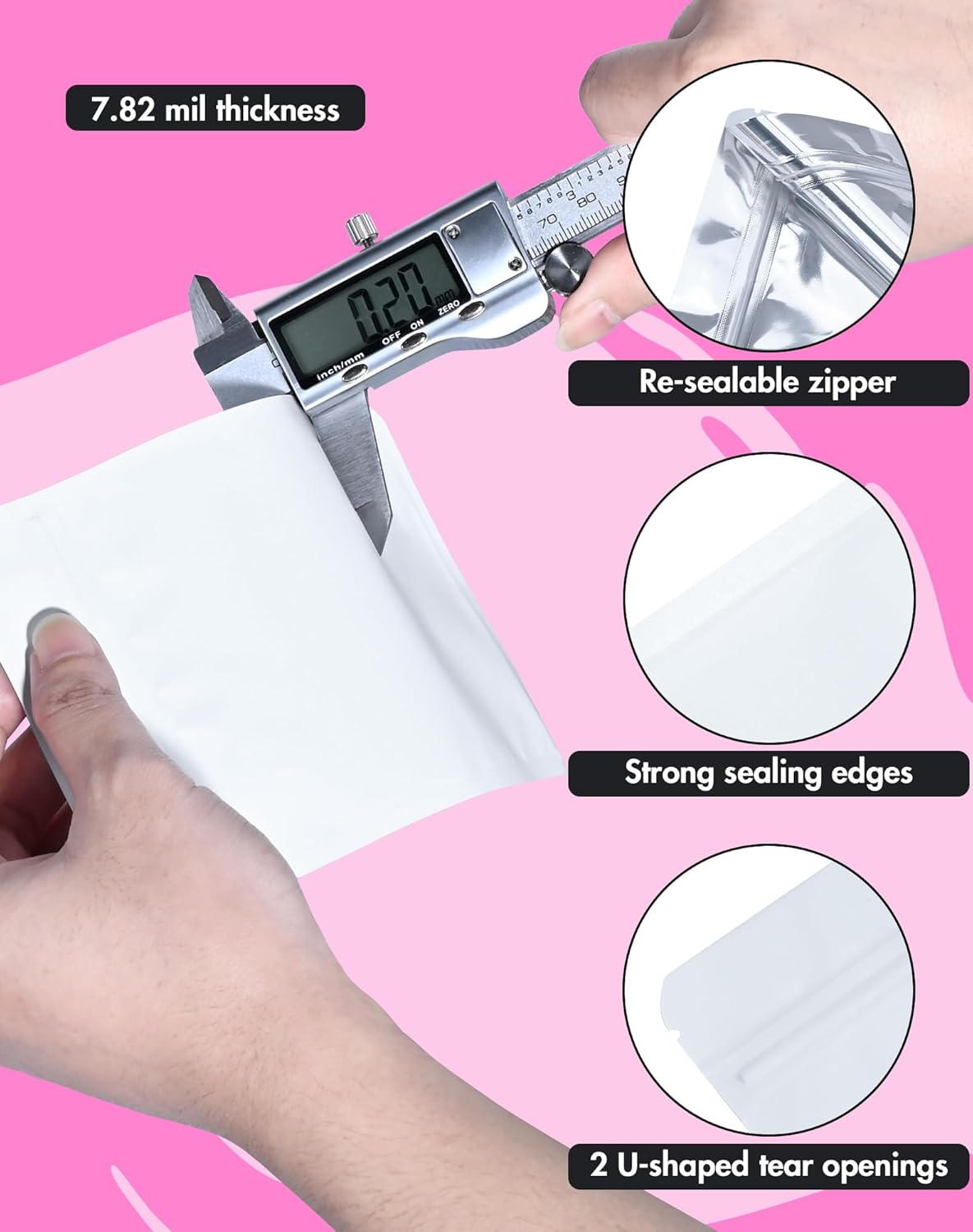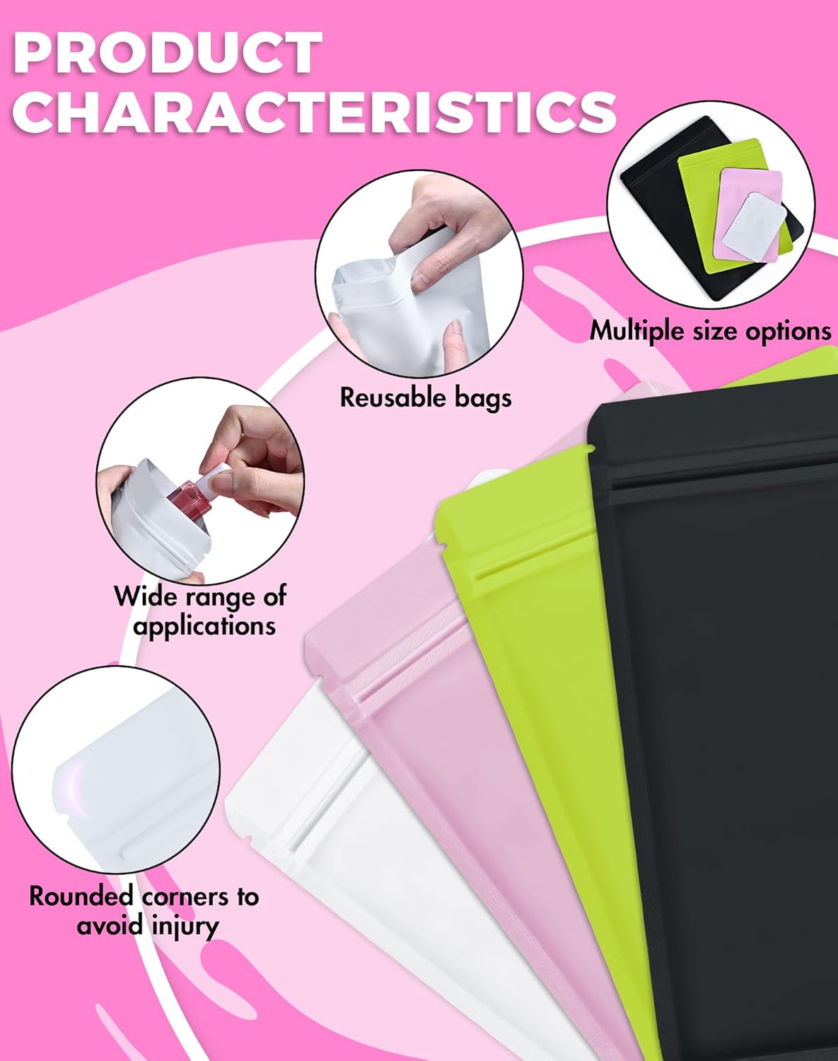 - Premium Quality Sealable Bags: Perfect resealable bags for food stronger with thick barrier layer, matte color surface and aluminum foil interior enhance the durability and aesthetics of the smell proof bags. The resealable zipper is strong enough and won't pop open to ensure the food is safe inside