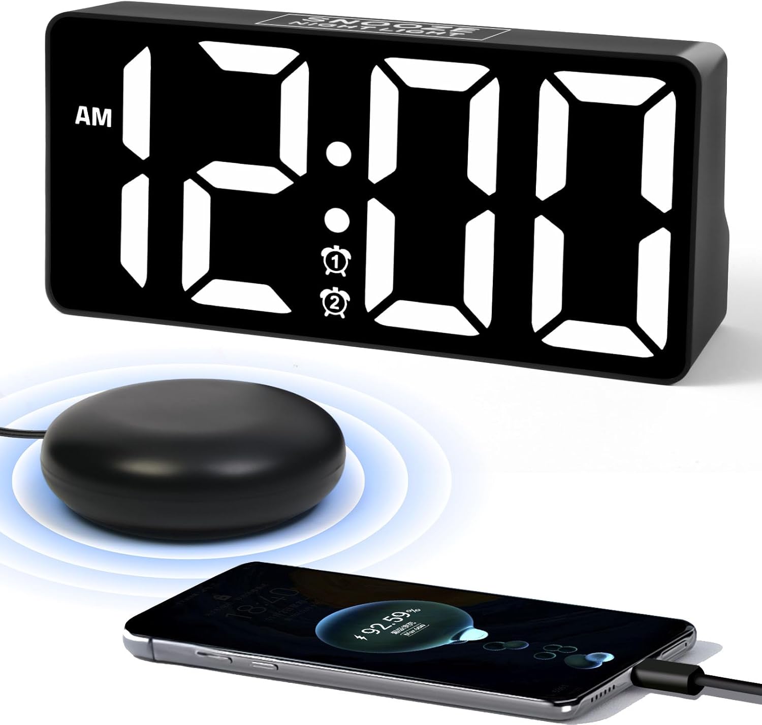 Alarm Clock for Bedroom Heavy Sleepers with Bed Shaker & Night Light-Vibrating Digital Clock Large Dimmable LED Digits with Dual Alarm & Charging Port Table Desk Clock for Hearing Impaired Seniors