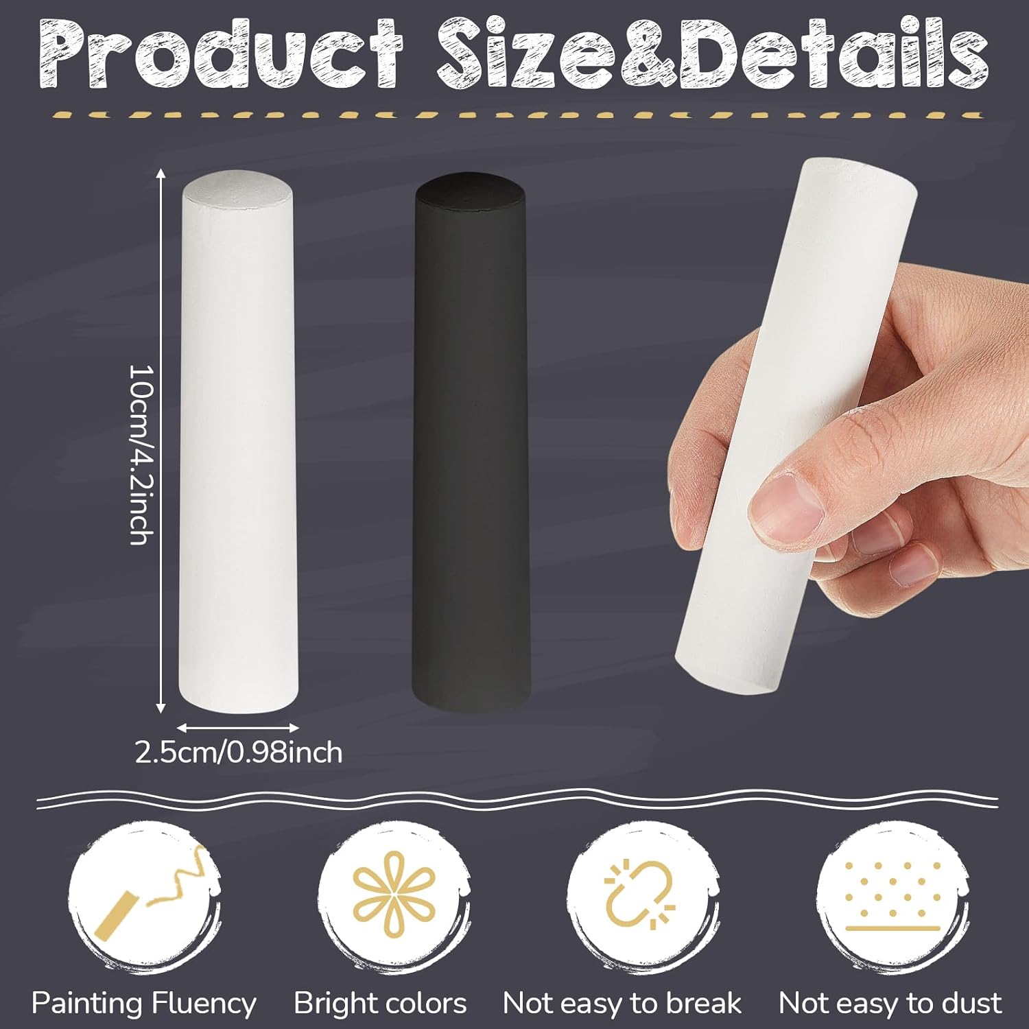 - Proper Size for Comfortable Hold: this sidewalk chalk measures about 4.13 x 0.87 x 0.98 inches, an appropriate size for an easy, comfortable grip; The size of the chalk makes them easy to manage, increasing its accessibility and use.If there is any damage, please contact us for return or exchange.