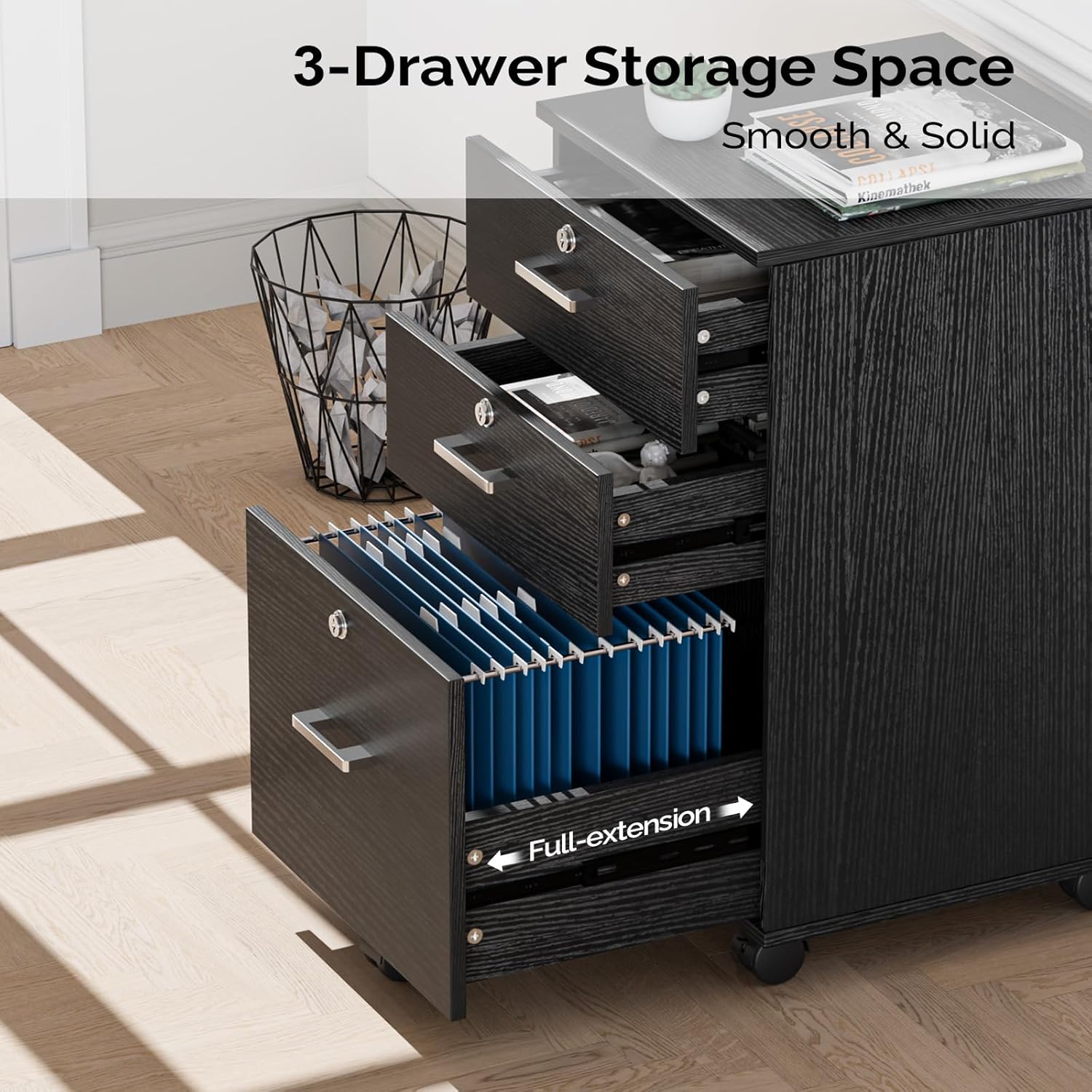 VINGLI 3-Drawer File Cabinet with Lock, Wood Rolling Filing Cabinets for Home Office, Mobile Printer Stand, Under Desk File Organizer for Letter Sized Files, 26" H(Caster Included), Black