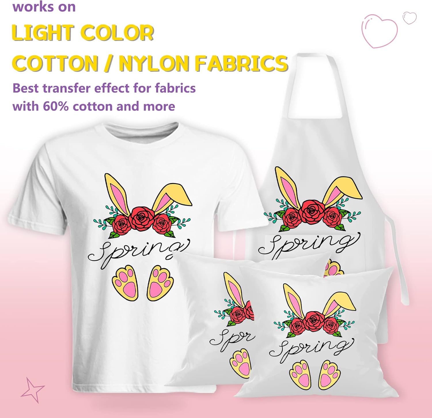 - WORK ON DARK COLOR COTTON & NYLON FABRICS: Pack of 50 sheets of 8.5x11" Light transfer paper for t shirts and 5 sheets of parchment paper. The printable iron on vinyl is suitable for light-color cotton and nylon fabrics and will perform the best transfer effect on more than 60% cotton