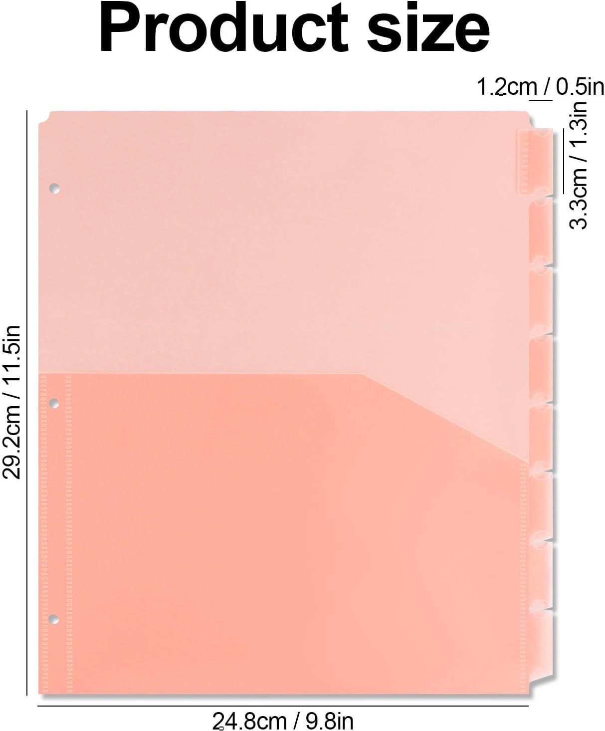 - 【Fits 3 RIng Binders】3 Holes punched, fit in 3 ring binders. Our Plastic Pocket Dividers are measured 9.8 x 11.5 inches, providing the maximum coverage for your letter-sized paper. There are a total of 8 dividers for 3 ring binder with pockets in the package.
