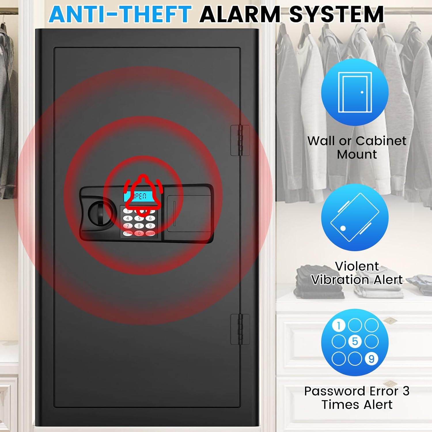 - ANTI-THEFT ALARM & ANCHORING DESIGN: Our fireproof safe comes with a dual alarm system to prevent password guessing and effectively deter unauthorized access. Enter the wrong password 3 times in a row will activate the alarm system and the safe will lock for 20 seconds. Anchoring design makes you easily fix the safe to the wall or floor, improving safety and reliability