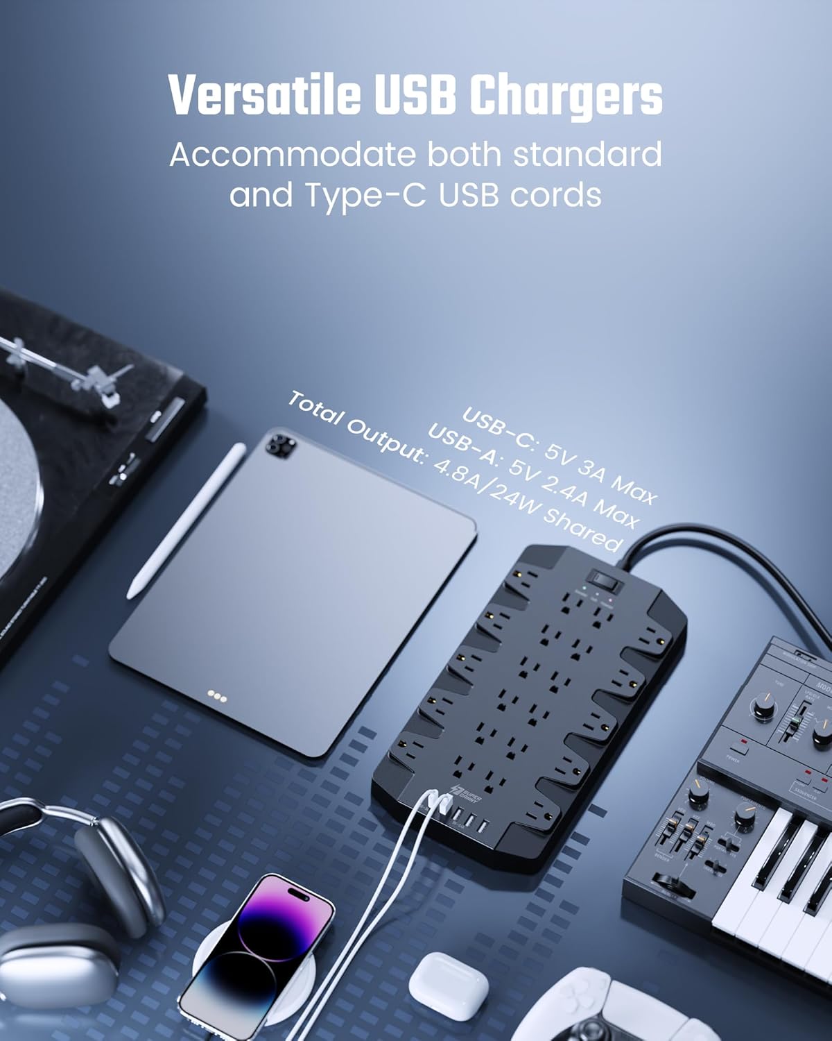 - 【2 USB-C & 4 USB-A Charging Ports】Tired of searching for adapters when the phone battery is low? With 2 USB-C ports and 4 USB-A ports, our USB power strip flat plug is here to simplify your charging needs. The inbuilt smart charging technology empowers the USBs to intelligently detect your electronic devices and charge them at optimal yet safe speeds—compatible with most USB devices. (Total Output: 4.8A/24W Shared, USB-C: 5V⎓3A, USB-A: 5V⎓2.4A)